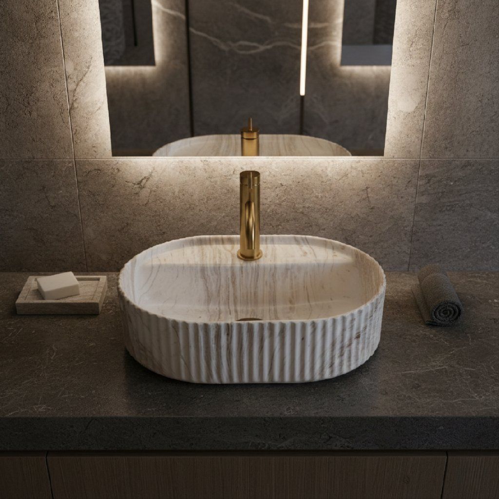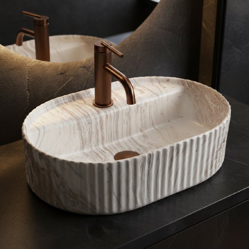 Umyvadlo na desku Rea Marcela Kallisto je moderní koupelnový prvek, který zaujme výraznou rýhovanou strukturou na vnější straně. Oválný tvar působí elegantně a harmonicky, zatímco vertikální drážky dodávají umyvadlu architektonický charakter a dělají z něj výrazný designový prvek koupelnové zóny. Povrch v odstínu béžová matná (Kallisto) s jemným kamenným dekorem působí přirozeně a luxusně. Tento dekor se výborně kombinuje s dřevěnými prkny, přírodním kamenem nebo moderními bateriemi v černé, zlaté či chromové barvě. Umyvadlo je vyrobeno z kvalitní sanitární keramiky, která je odolná, hygienická a velmi jednoduchá na údržbu