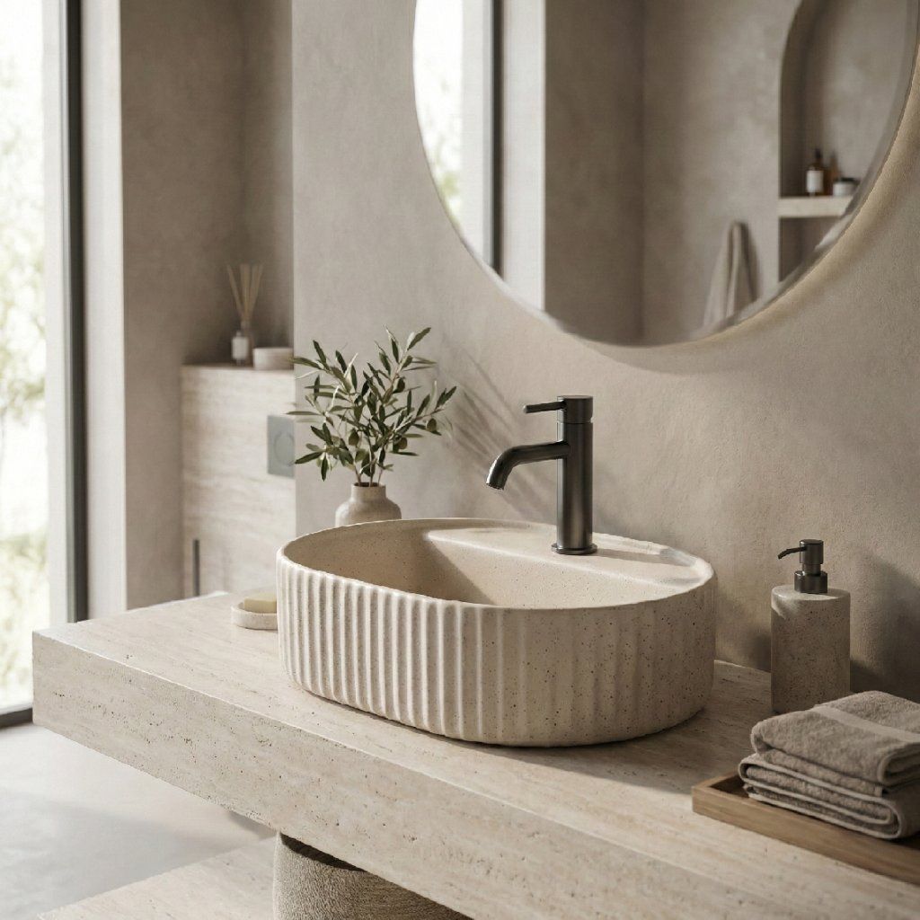 Umyvadlo na desku Rea Marcela Vanilla je elegantní a moderní prvek koupelnového interiéru. Oválný tvar doplňuje dekorativní rýhovaná struktura na vnějších stěnách, která dodává umyvadlu výrazný architektonický charakter a činí z něj stylový doplněk koupelnové zóny. Povrch v odstínu Vanilla s jemnou tečkovanou texturou vytváří přirozený, mírně kamenný efekt. Tento teplý béžový tón působí harmonicky a snadno se kombinuje s přírodním dřevem, kamennými deskami nebo moderními bateriemi v černé či zlaté barvě. Umyvadlo je vyrobeno z kvalitní sanitární keramiky, která je odolná, hygienická a snadno se čistí.