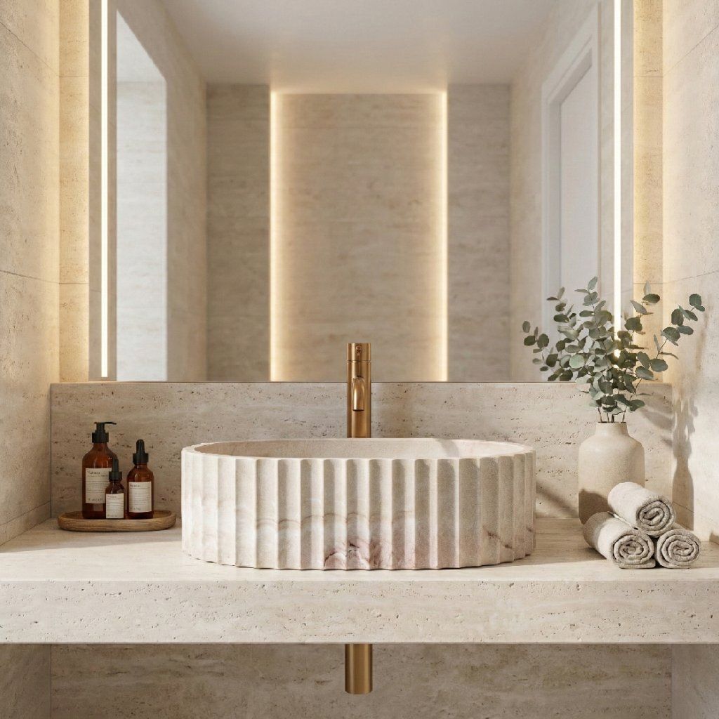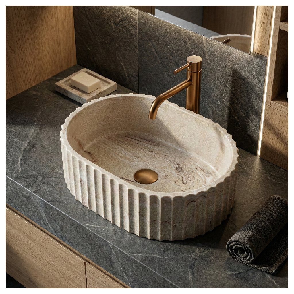 Umyvadlo na desku Rea Margaret Gio je výrazný designový prvek, který spojuje přirozenou estetiku kamene s moderní architektonickou formou. Oválný tvar doplňuje dekorativní rýhovaná struktura na vnějších stěnách, která dodává umyvadlu dynamický a sochařský charakter. Díky tomu se stává dominantou koupelnové zóny a ideálně doplní moderní i přírodně laděné interiéry. Povrch v odstínu béžová – imitace kamene Gio Stone s jemným přirozeným žilkováním přináší do koupelny teplý a harmonický vzhled. Umyvadlo je vyrobeno z kvalitního kompozitního materiálu Artificial Stone, který je odolný vůči poškrábání, zabarvení a každodennímu používání. Hladký vnitřek mísy zároveň usnadňuje čištění a zajišťuje pohodlné používání.