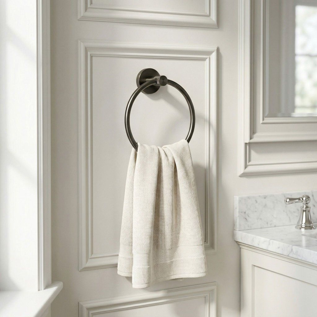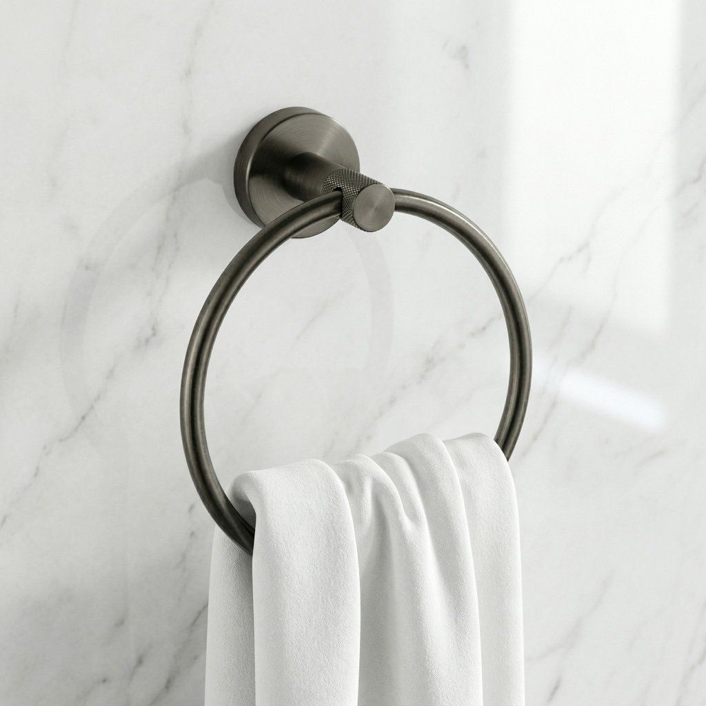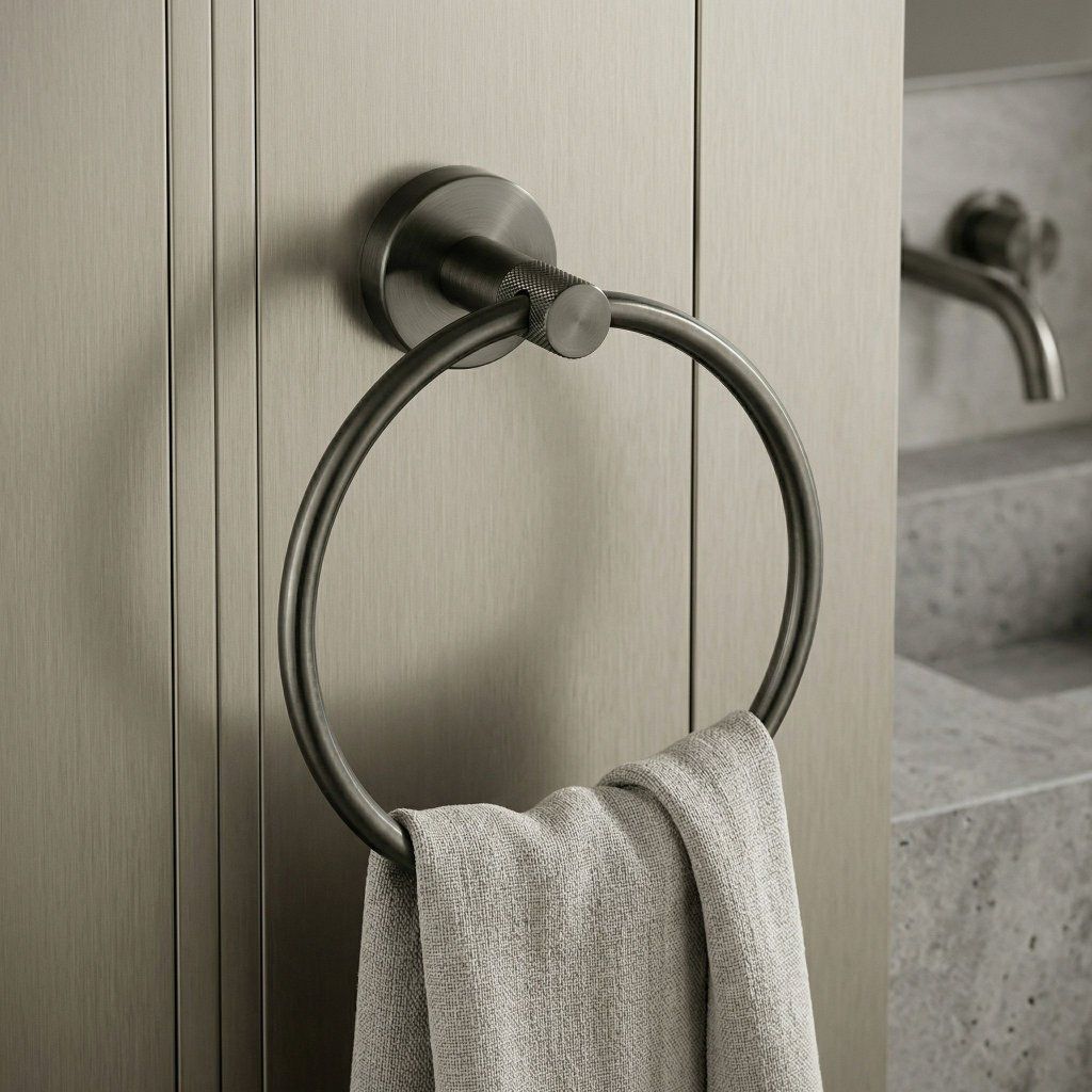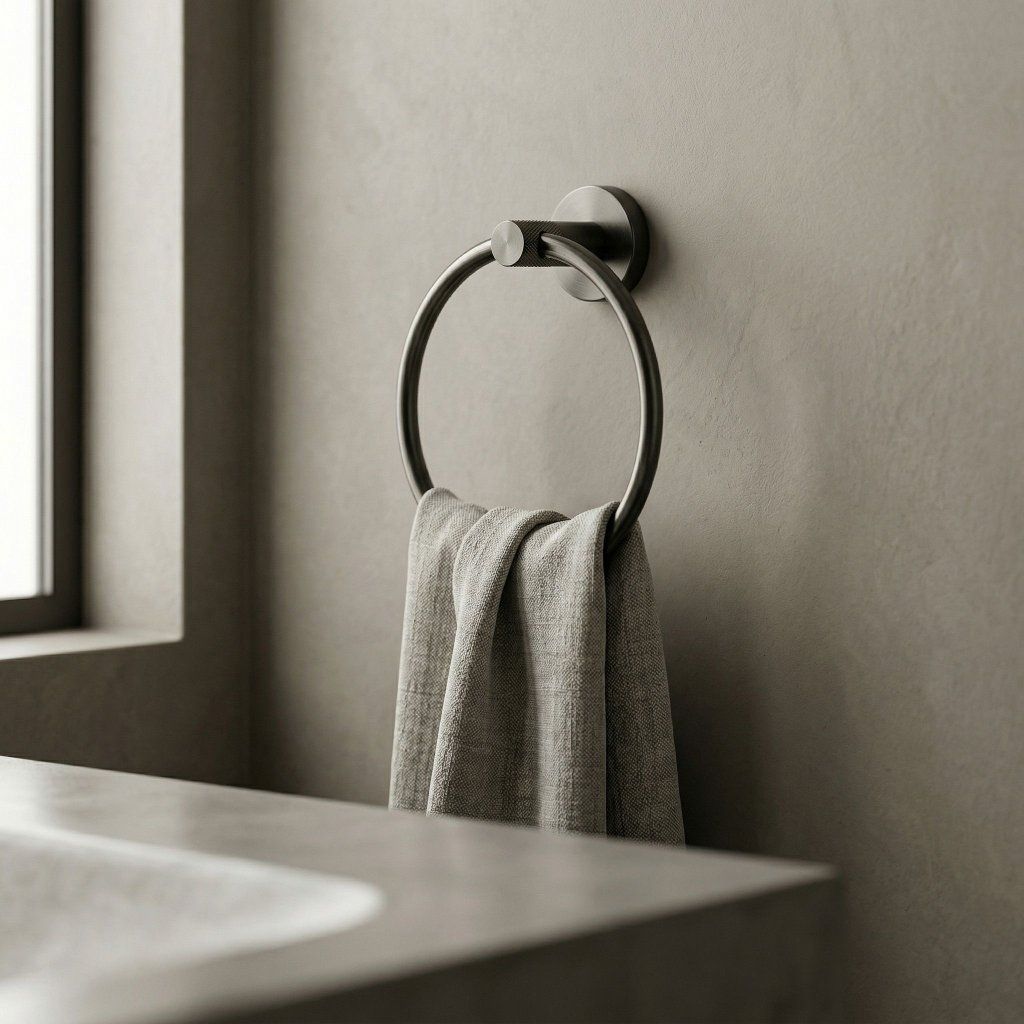 Kruhový věšák v titanové barvě je přesně tím detailem, který odliší běžnou koupelnu od promyšleného interiéru. Geometrická čistota prstence ladí s moderní podomítkovou armaturou, čtvercovými umyvadly is dlažbou ve velkých formátech.