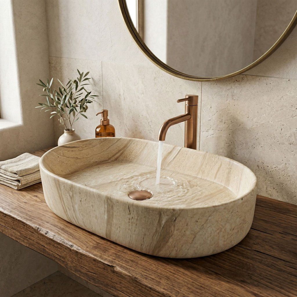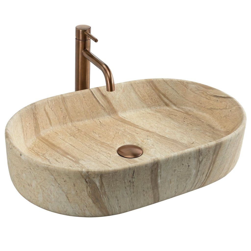 Umyvadlo na desku Rea Nadia 60 v provedení Sahara vnáší do koupelny teplý, přirozený charakter inspirovaný travertinem a onyx kamenem. Jemná páskavá struktura povrchu v béžovo-pískových tónech je unikátní – každý kus působí jako samostatná přírodní kompozice, která povyšuje koupelnu na prostor s výrazným dekorativním gestem.