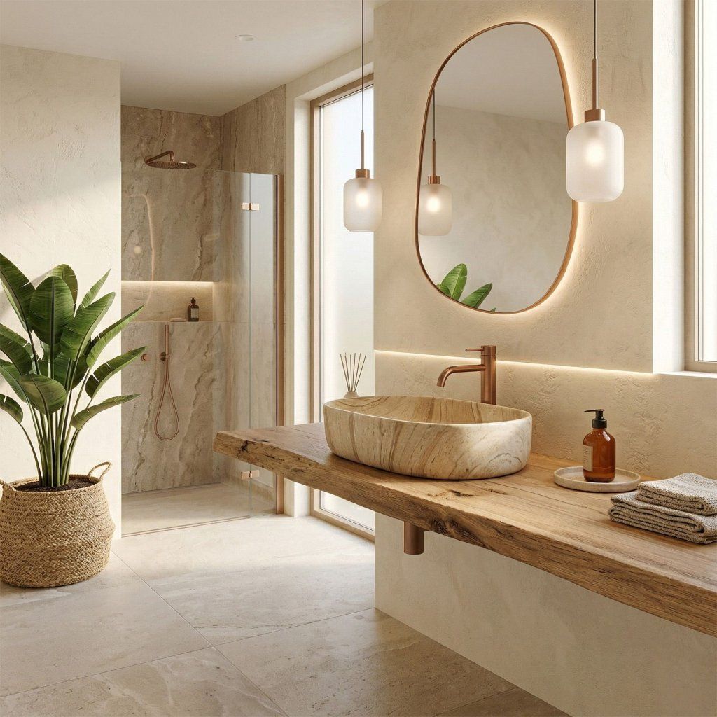- Teplý béžový odstín – přírodní charakter pro moderní i elegantní koupelny