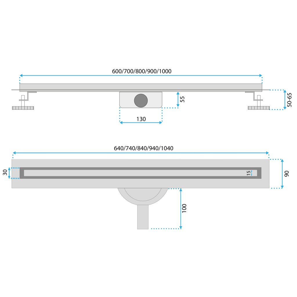 Sprchový žlab je vybaven nastavitelnými nožičkami, které poskytují plnou kontrolu nad instalační výškou, což umožňuje jeho přizpůsobení individuálním požadavkům a podmínkám instalace. Rozsah nastavení je od 50 mm do 65 mm, což umožňuje přesné umístění odtoku v závislosti na místě instalace.