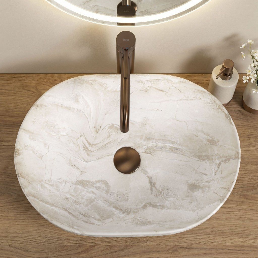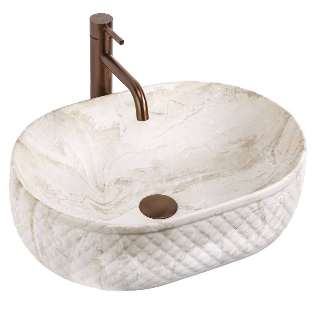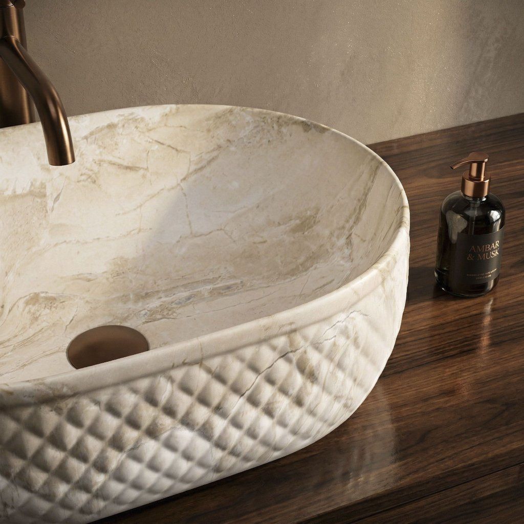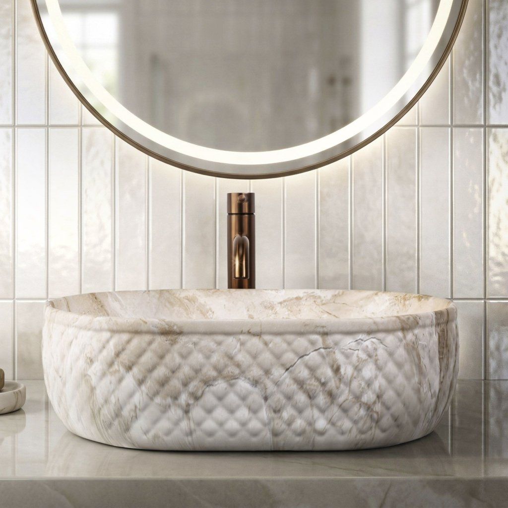 Oválná linie bez ostrých rohů vizuálně změkčuje geometrii koupelny – výsledek působí organicky a jemně, což je v souladu s kamennou estetikou povrchu. Umyvadlo je navrženo pro montáž na desku nebo skříňku , přičemž celý reliéfní plášť zůstává plně exponován.