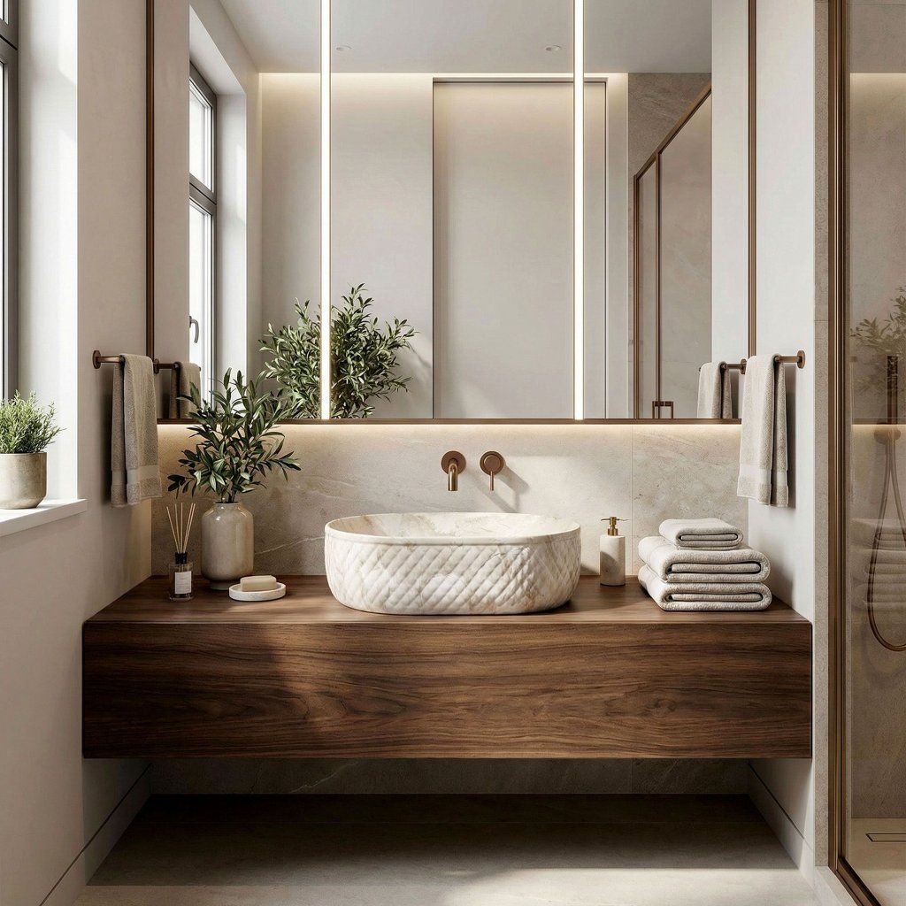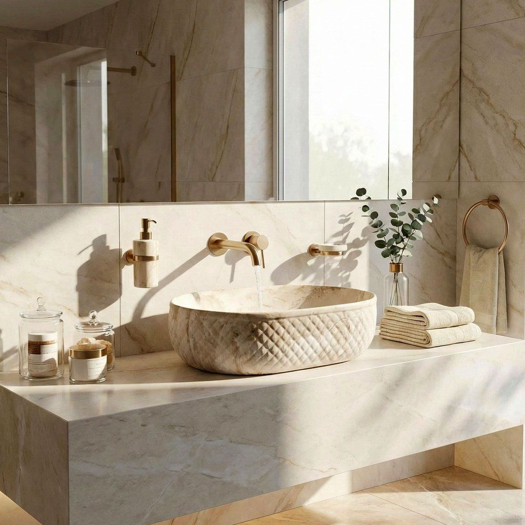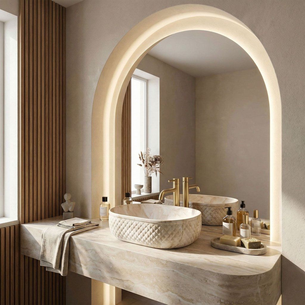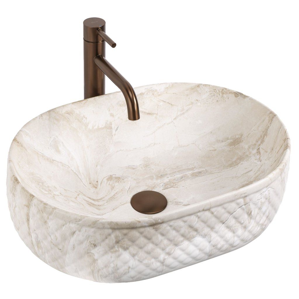 Oválná linie bez ostrých rohů vizuálně změkčuje geometrii koupelny – výsledek působí organicky a jemně, což je v souladu s kamennou estetikou povrchu. Umyvadlo je navrženo pro montáž na desku nebo skříňku , přičemž celý reliéfní plášť zůstává plně exponován.