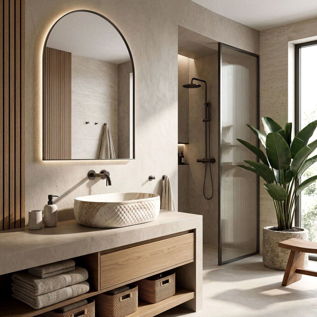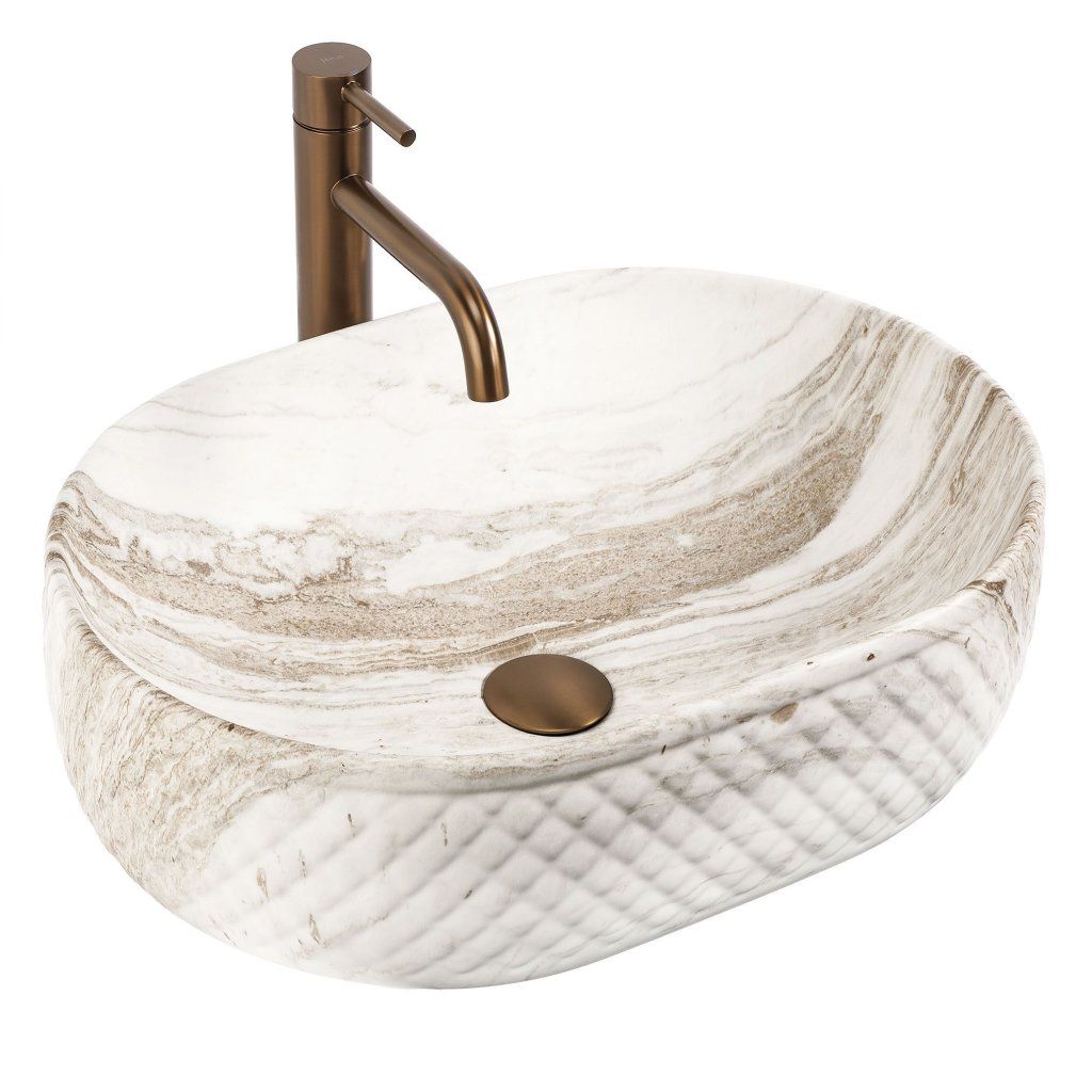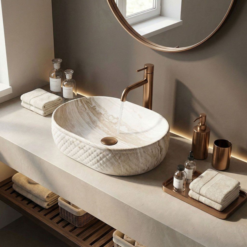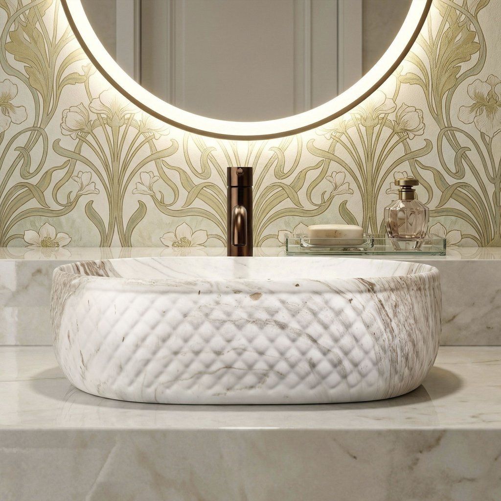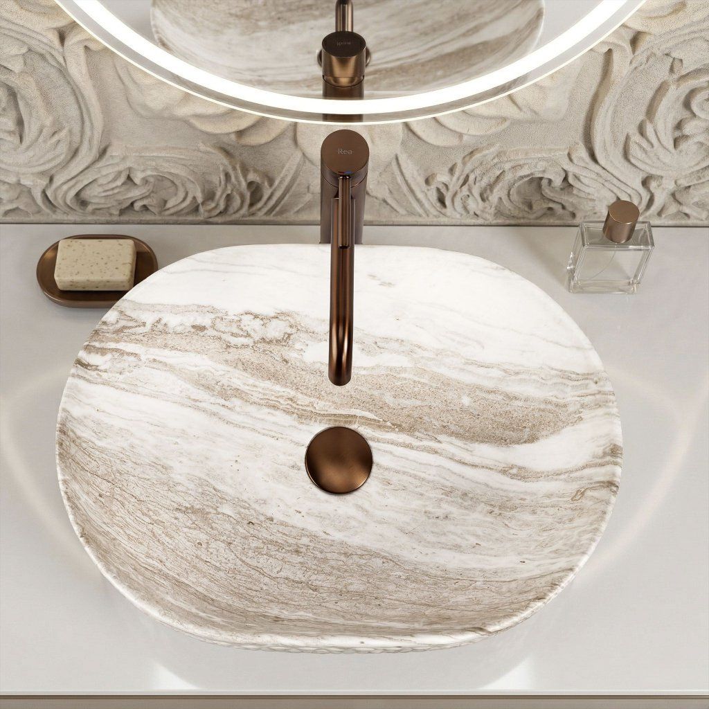 Oválná linie bez ostrých rohů změkčuje geometrii koupelny a vizuálně harmonizuje s organickým charakterem kamenného vzoru. Umyvadlo je navrženo pro montáž na desku nebo skříňku – celý reliéfní plášť zůstává plně exponován jako sochařský objekt.