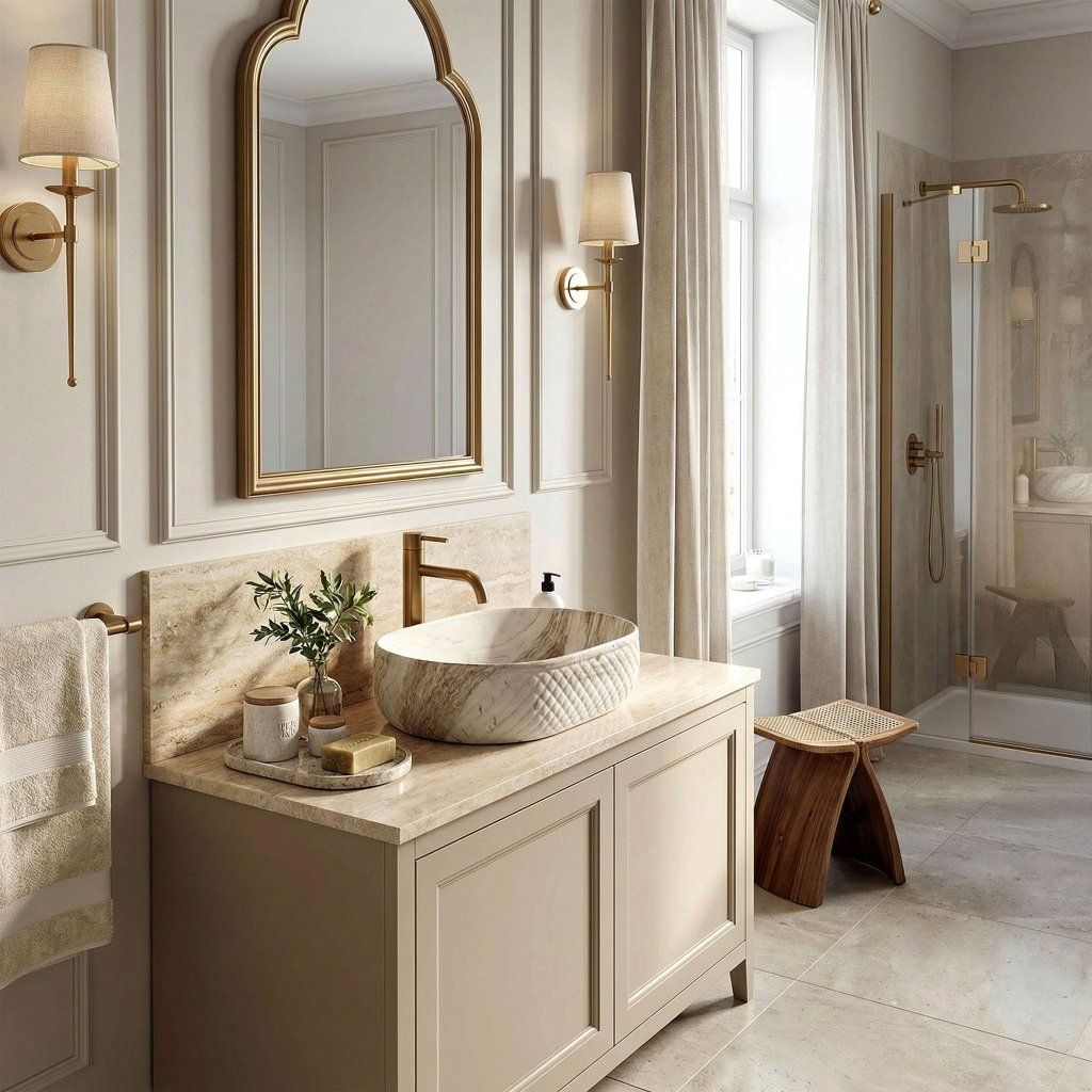 NÁŠ TIP: Kamenný vzor Saturn vynikne v kombinaci se zlatou nebo měděnou baterií pro teplý luxusní look – nebo s černou matnou pro současný, ostřejší kontrast. Všechny tři kombinace jsou pro kamenný povrch ověřeny.