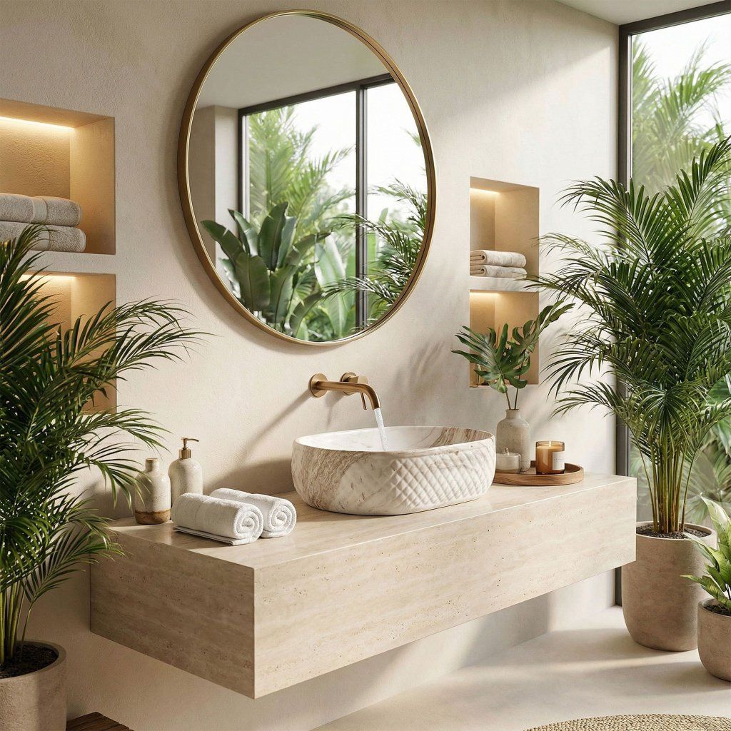 Umyvadlo nemá otvor pro baterii ani přepad — baterie se instaluje samostatně na stěnu nebo desku vedle mísy. Tato volba zachovává čistotu reliéfního povrchu a dává volnost při výběru armatury přesně podle vašeho stylu a barevného schématu koupelny.
