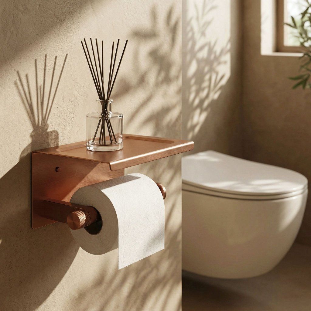Držák toaletního papíru s poličkou ze série Ori v měděném matném provedení je důkazem, že i funkční doplněk může být šperkem koupelny. Hluboký teplý odstín kartáčované mědi dodává interiéru elegantní a neotřelý charakter – a matná struktura povrchu zároveň efektivně maskuje běžné stopy každodenního používání.