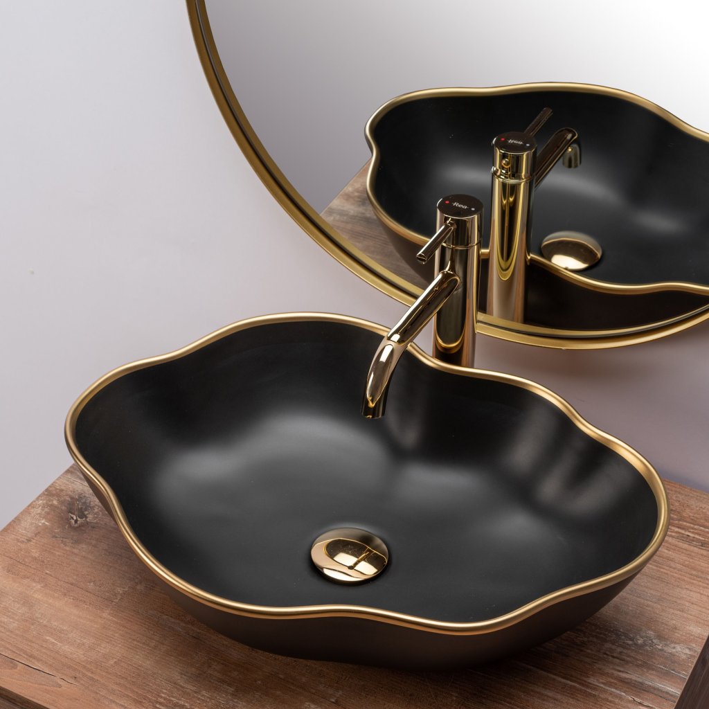 Umyvadlo je vyrobeno z nejkvalitnější černé keramiky se zlatým, nepravidelně tvarovaným lemem. Matný povrch dodá třídu a ozdobí interiér. Bude skvělým doplňkem pro milovníky nestandardních tvarů, vnese eleganci do zařízení koupelny doma i v kanceláři.