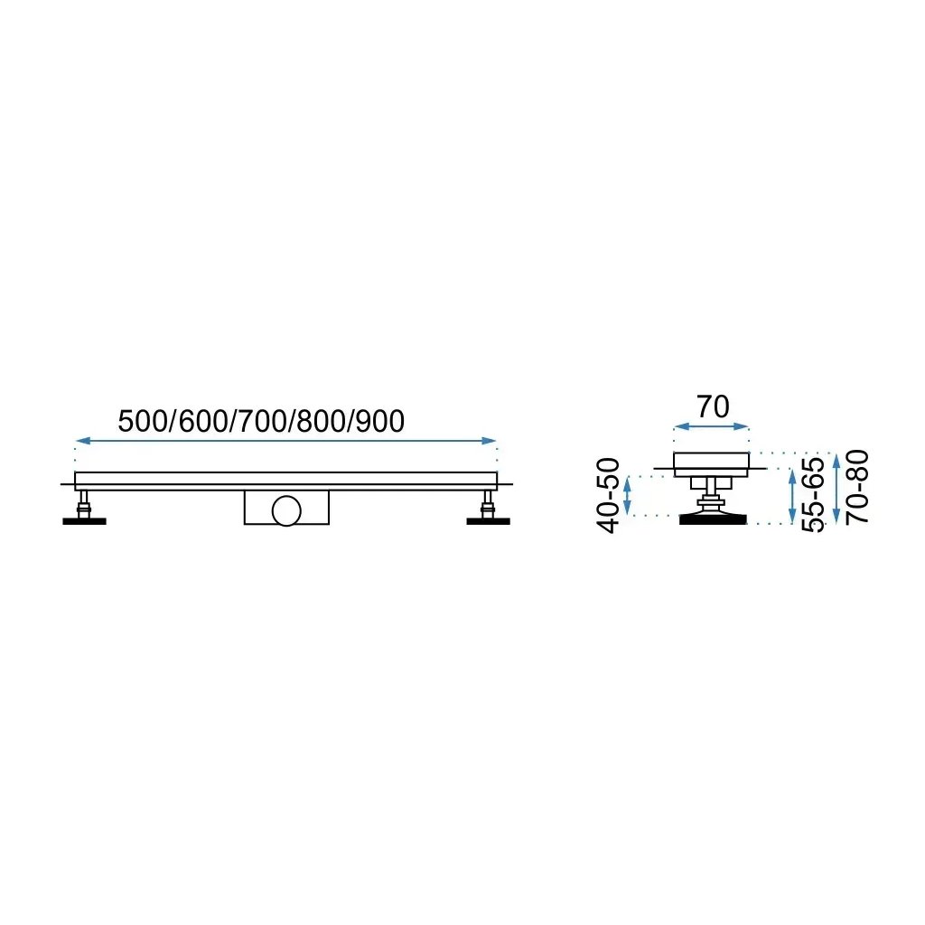 Použité nohy dávají možnost úplného nastavení výšky odtoku dle potřeb a možnosti montáže. Minimální rozsah nastavení je 52 mm a maximální 70 mm. Nízký profil 52 mm je v současnosti nejnižším lineárním odtokem dostupným na trhu.