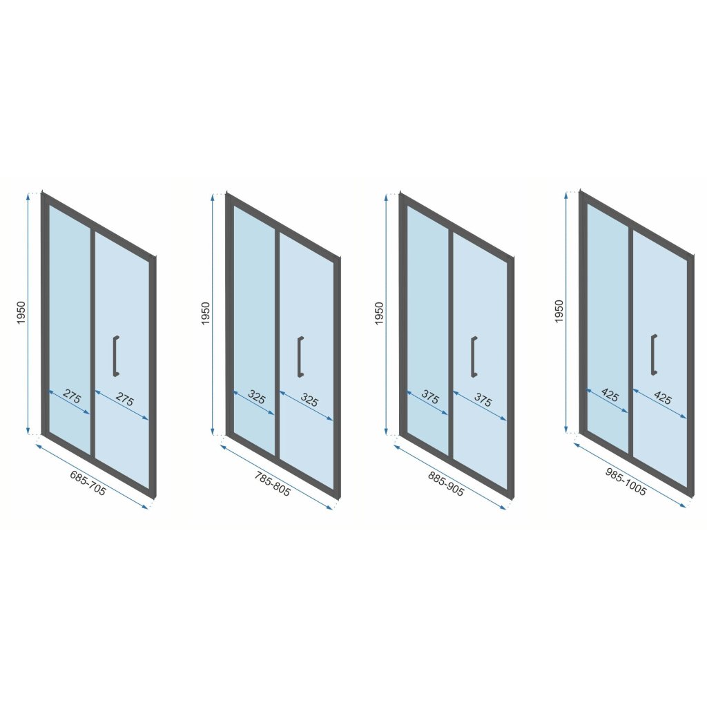 - Tloušťka skla: 4 mm (dveře) / 6 mm (pevná skleněná stěna)