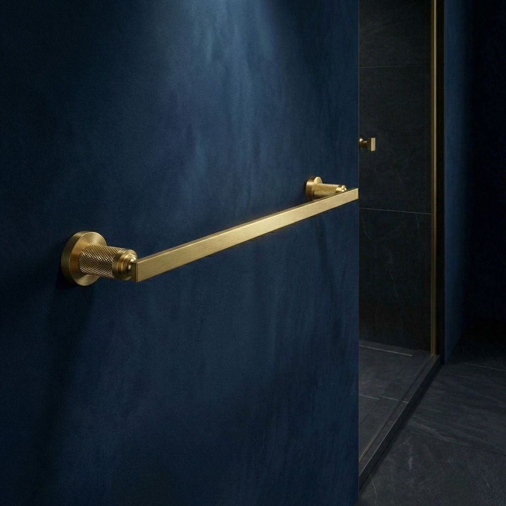 Tyto detaily nejsou jen estetické – vroubkování zvyšuje pevnost úchytů a vizuálně odlehčuje masivnost kovu. Výsledek působí jako pečlivě vybraný šperkovnický detail, nikoli jako běžný koupelnový doplněk.