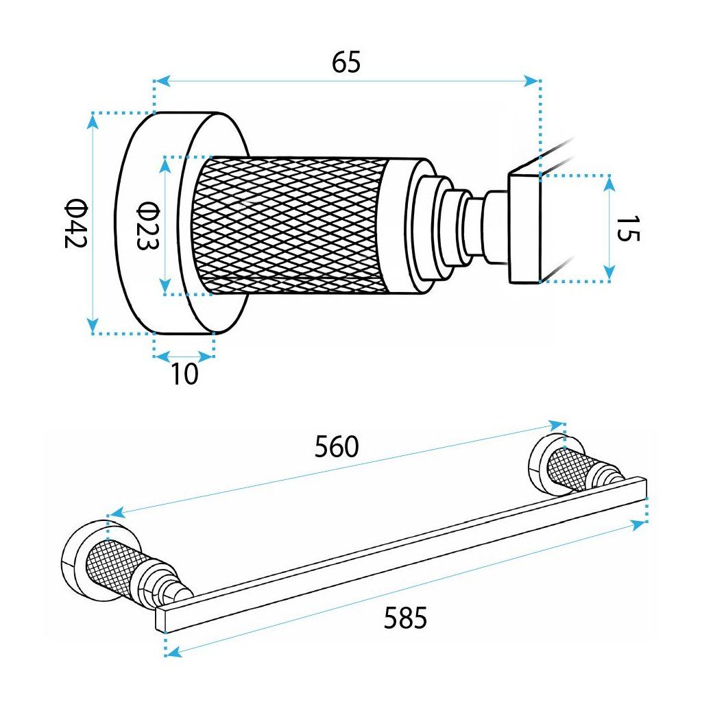 Hloubka 65 mm od stěny zajišťuje, že i silnější froté ručník se vejde ke stěně a zůstává dobře větraný ze všech stran. Výška upevňovacích ramen je 42 mm – kompaktní, ale dostatečně pevná geometrie.