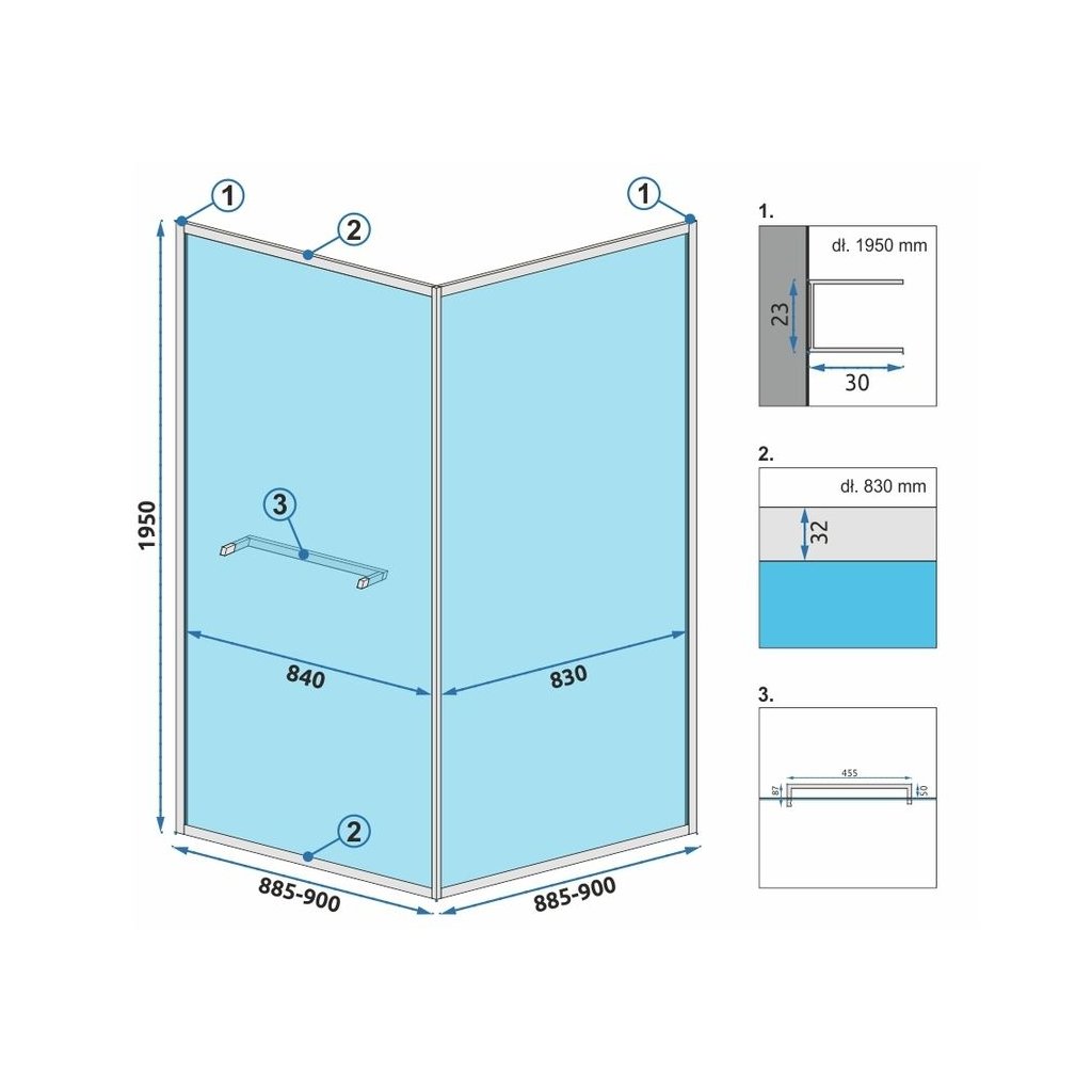 - Rozměry: 88,5 (dveře) x 88,5 (stěna) x 195 cm