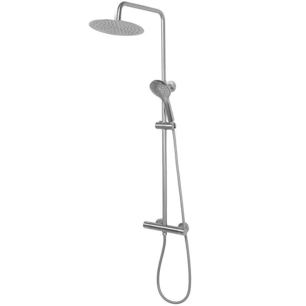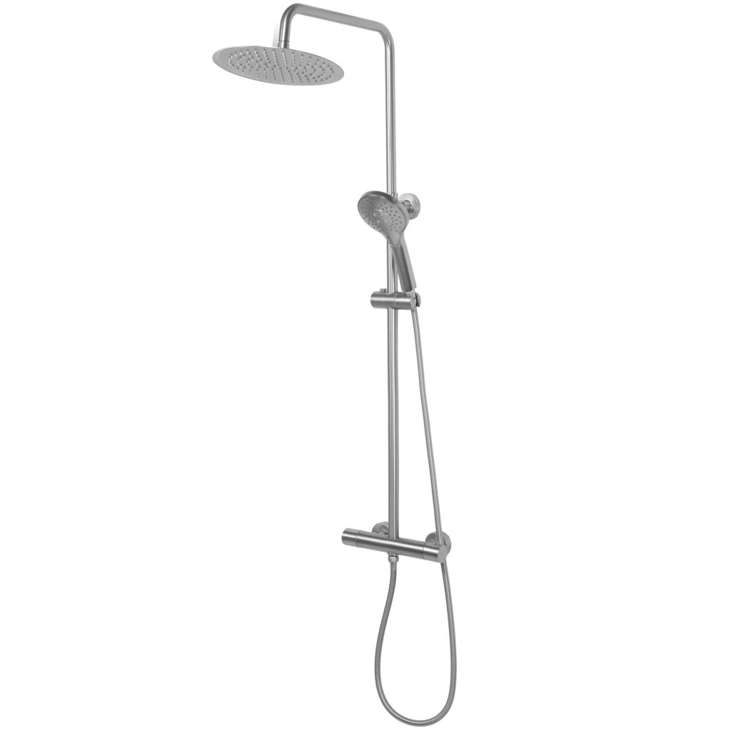- Složení sady: termostatická baterie 150 mm, sprchová hadice s ruční sprchovou hlavicí 3-funkční, sprchový sloup s dešťovou hlavicí