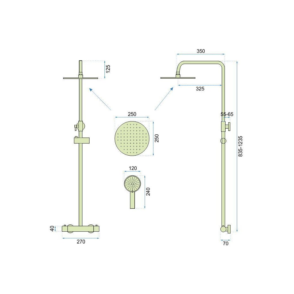 - Nastavitelná výška sprchového sloupu: 835 - 1235 mm