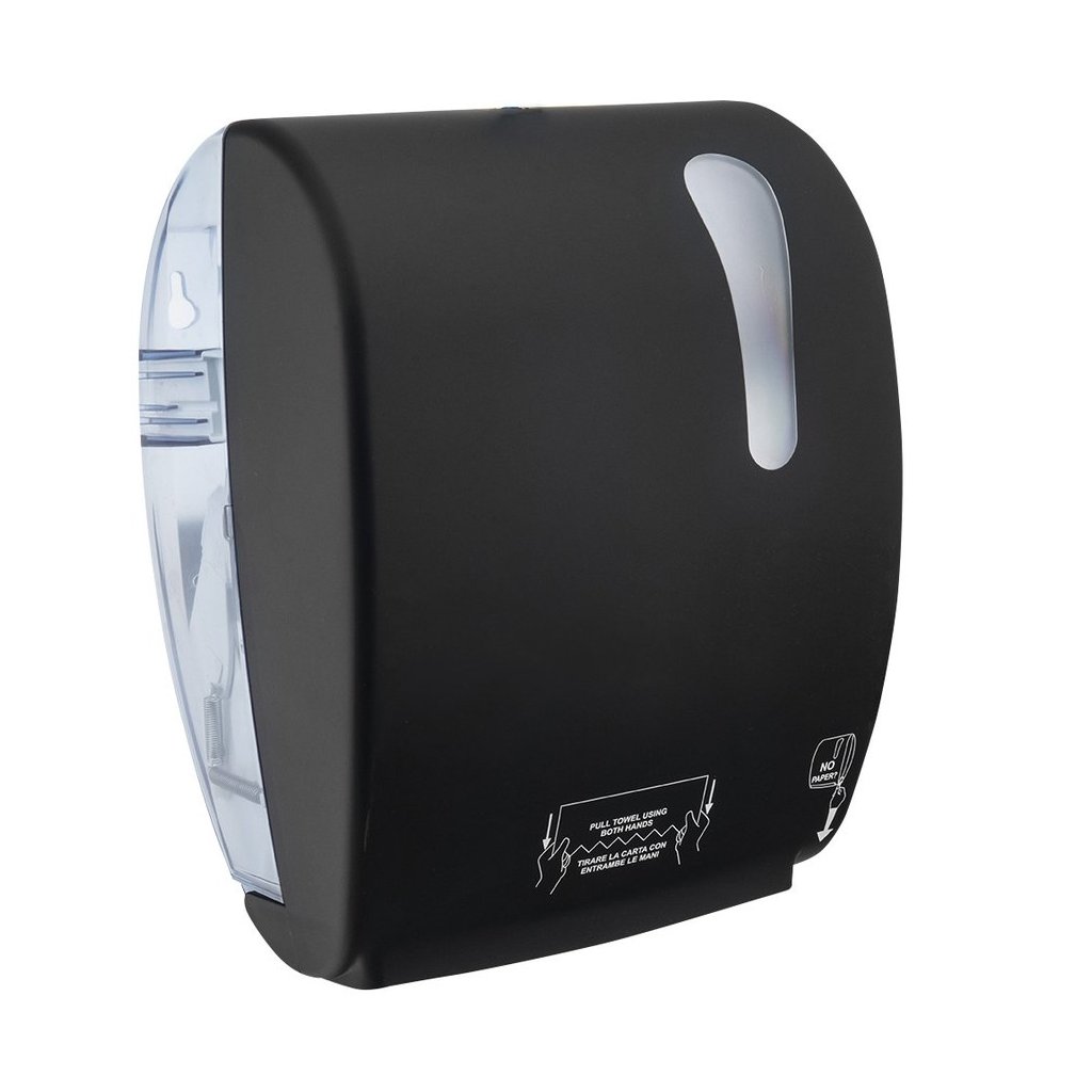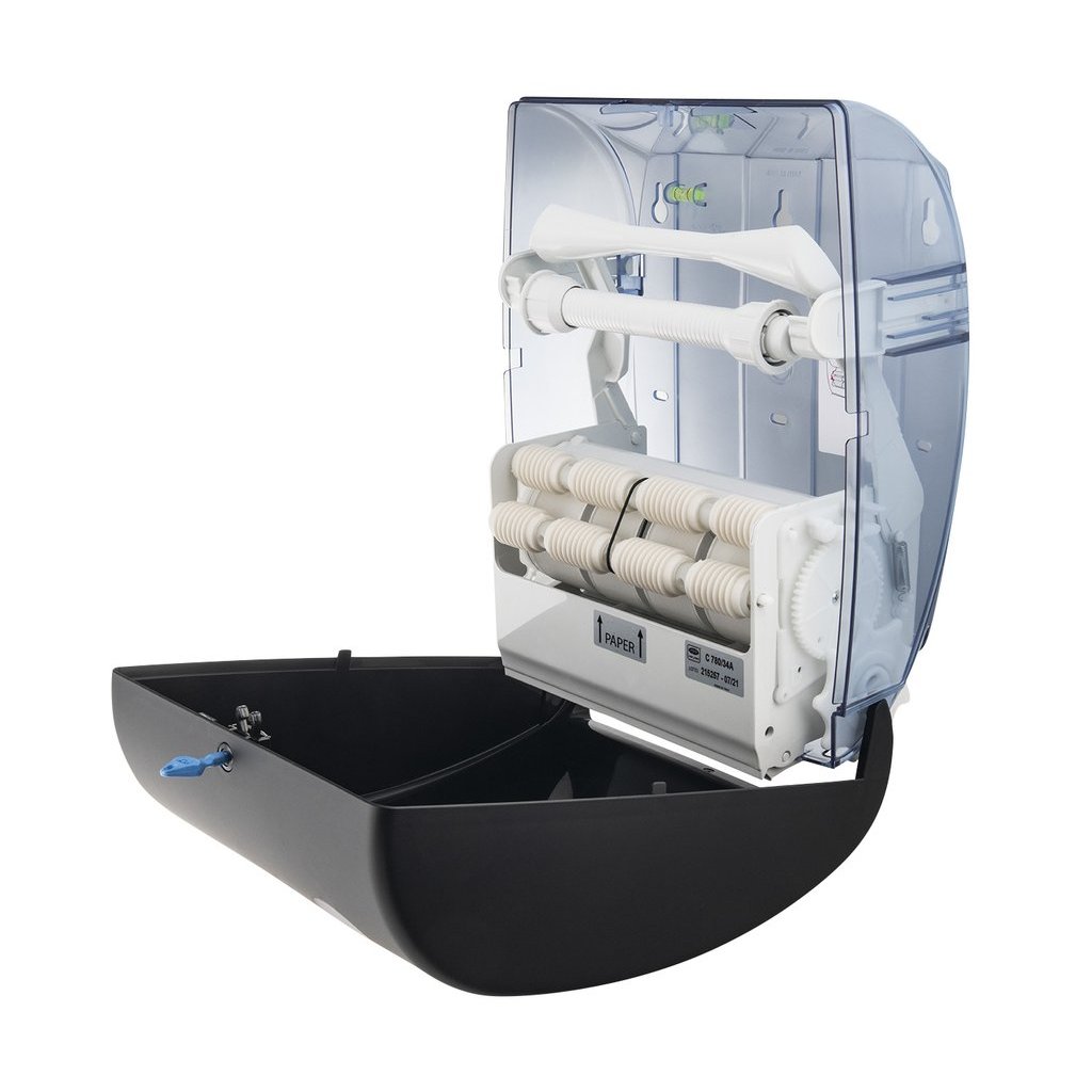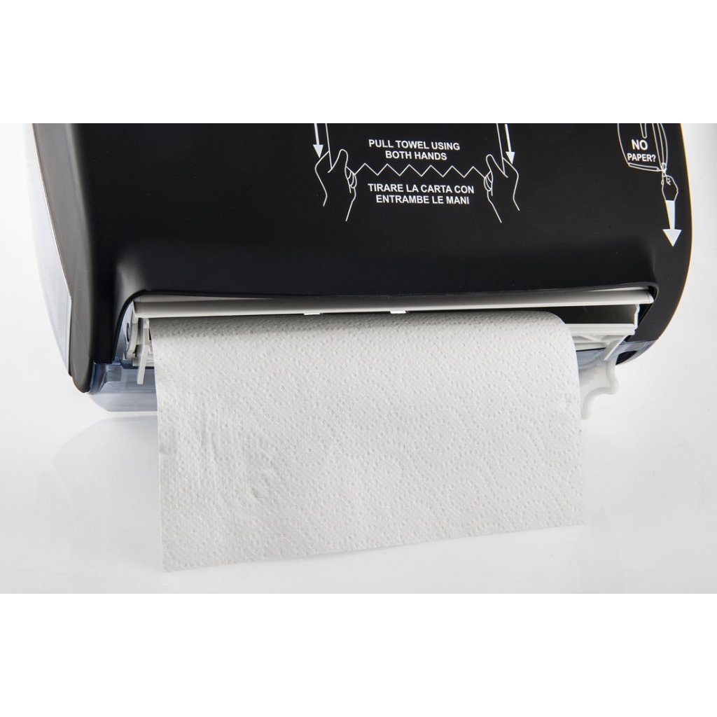 Plastový zásobník na papírové ručníky v roli s automatickým ořezem. Výkonný řezací mechanismus umožňuje plynulé dávkování po jednom útržku. Velká kapacita snižuje nutnost častého doplňování. Ideální pro rušné toalety např. ve školách, továrnách nebo na letištích. Polotransparentní okénko poskytuje dobrý přehled, kdy je třeba obsah doplnit.
