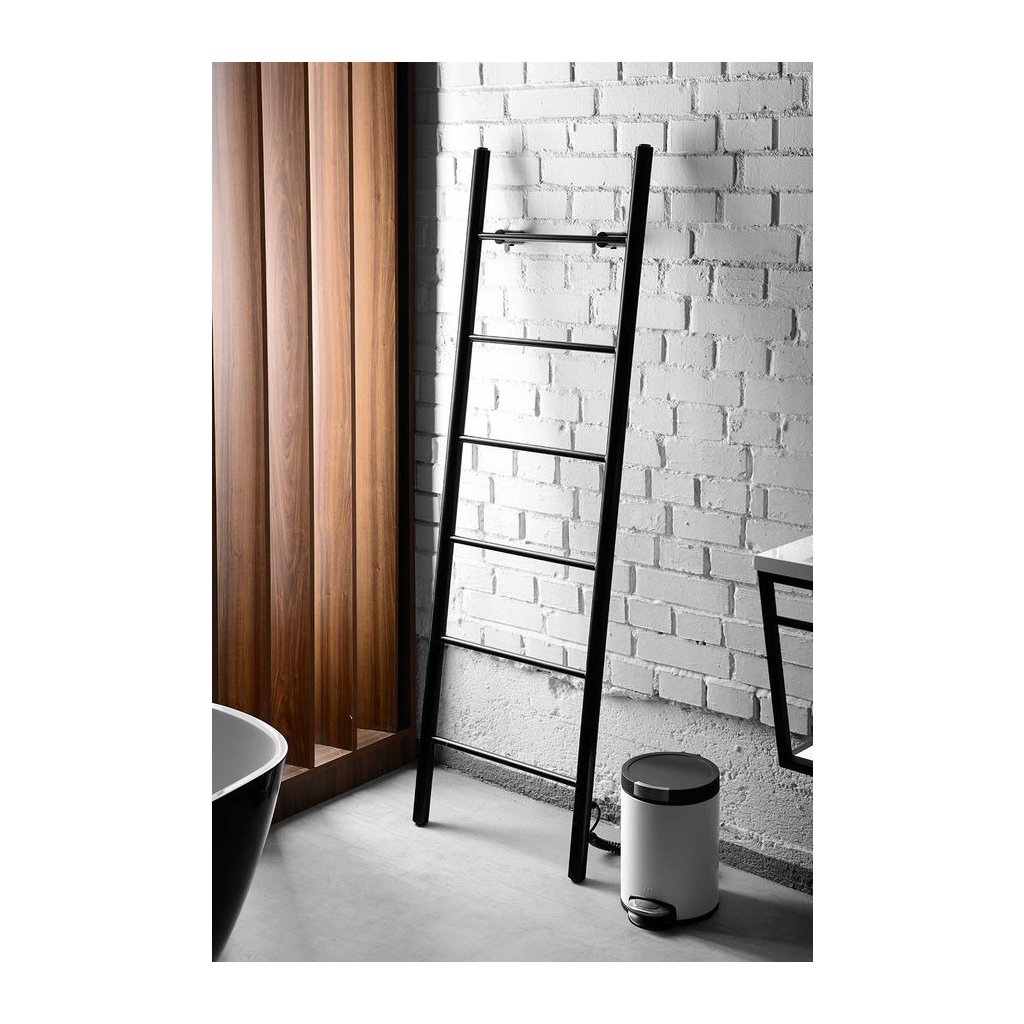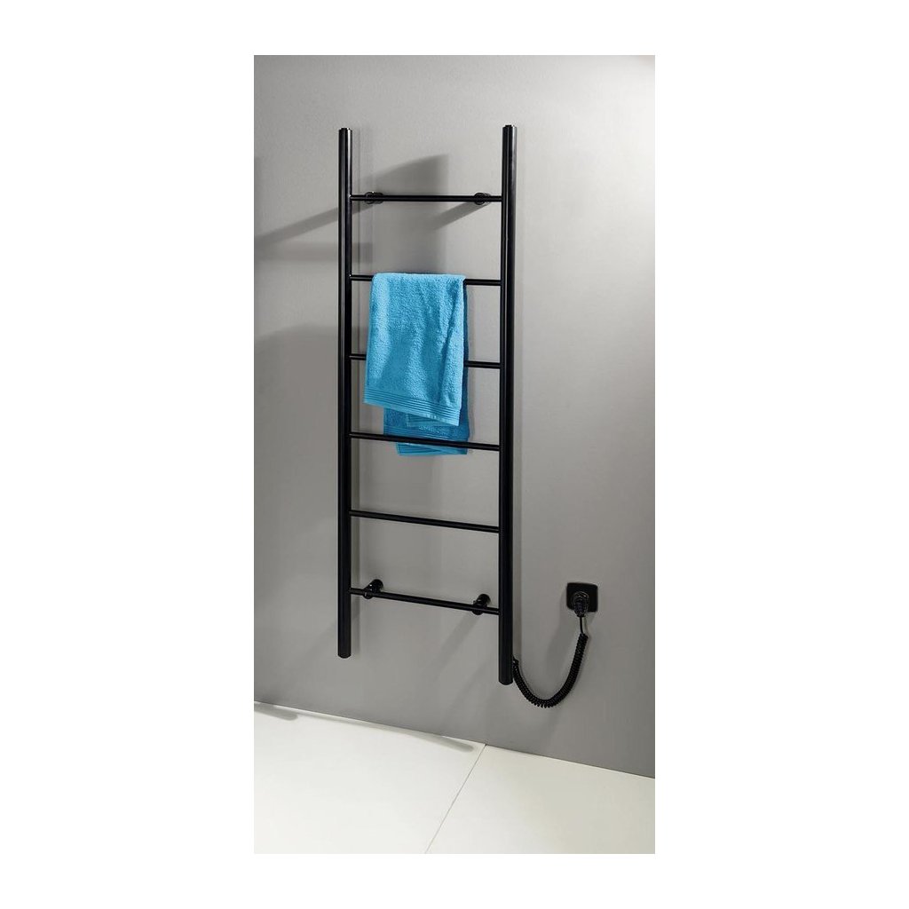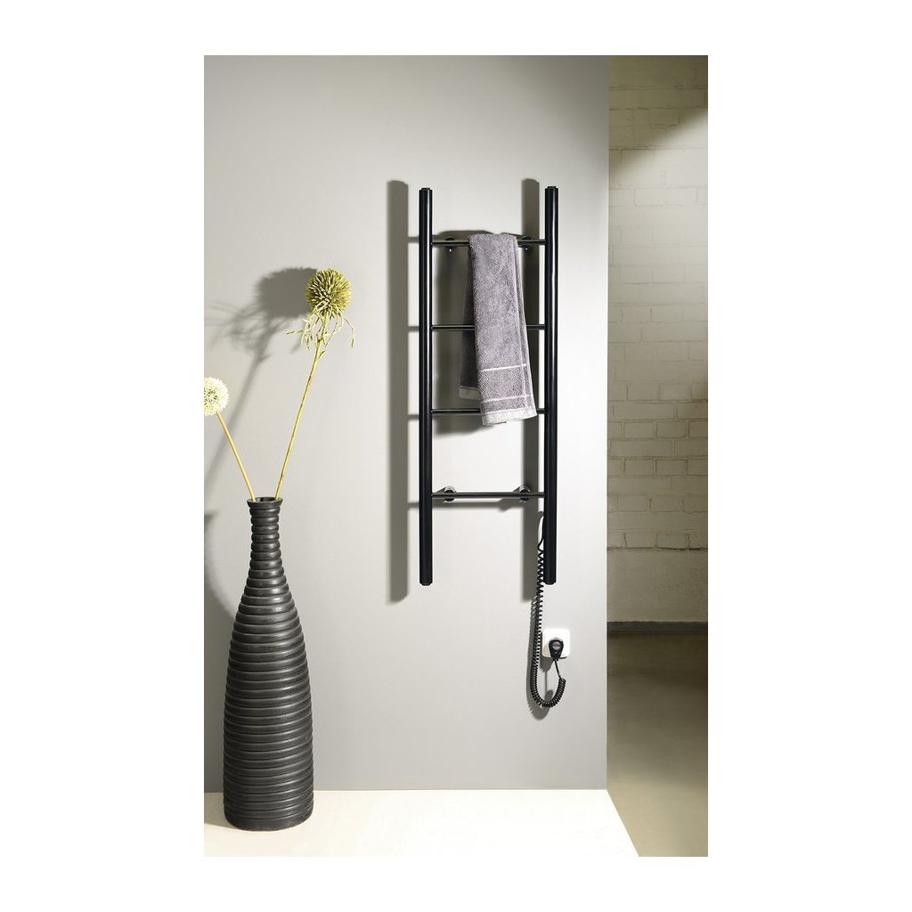 Elektrický sušák ručníků do moderního interiéru - v matně černé barvě jsou nejen trubky a uchycení, ale i napájecí kabel a elektrická zástrčka.