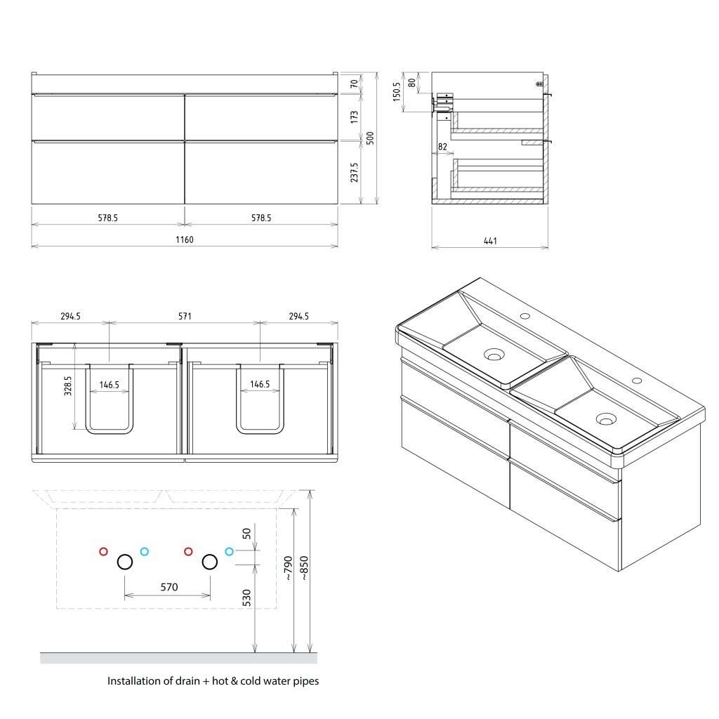 Sapho, SITIA dvouumyvadlová skříňka 116x50x44,2cm, 4x zásuvka, borovice rustik, SI120-1616
