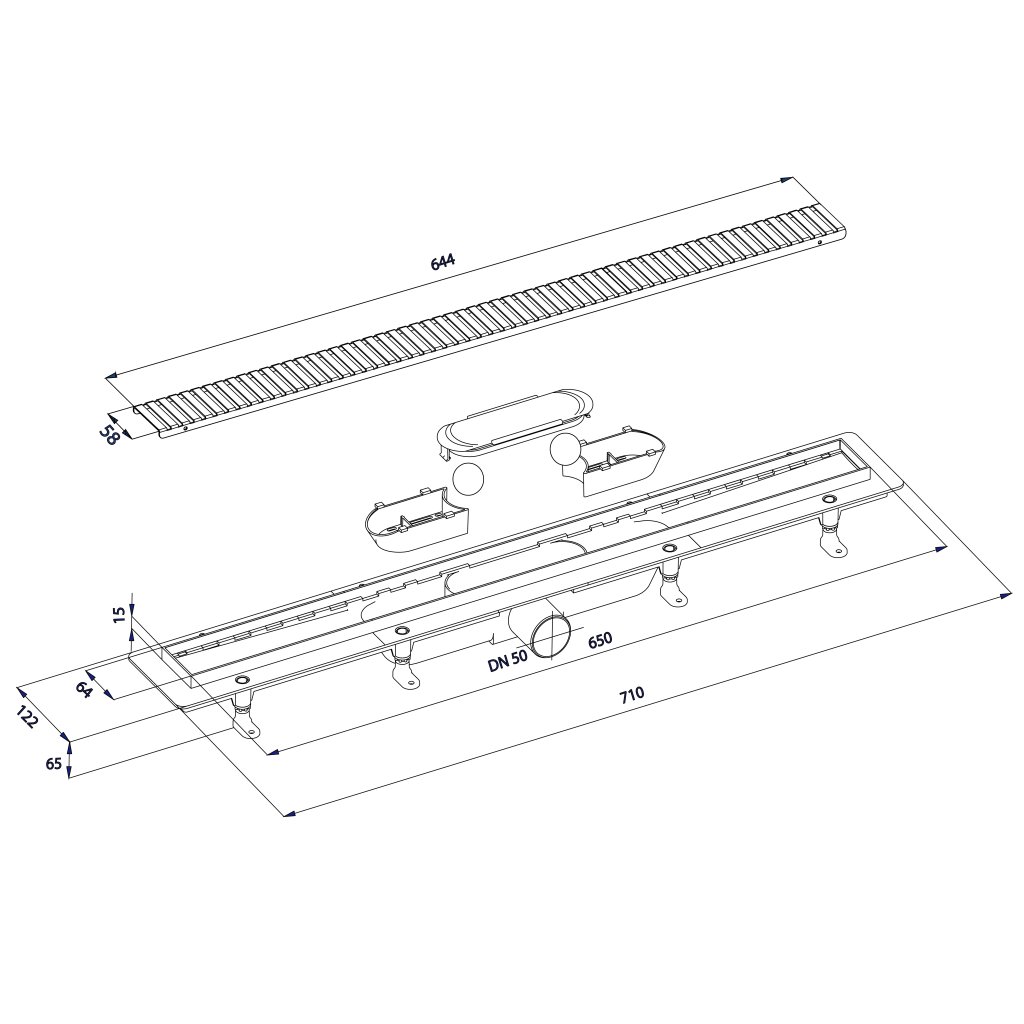 Sapho, Sprchový kanálek s nerezovým roštem, DN50, 710x122x65 mm