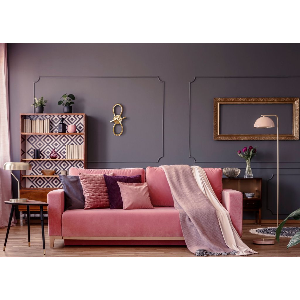 Lampa zlaté barvy nezahyne na pozadí bílé stěny a prostorová forma dává lehkost.