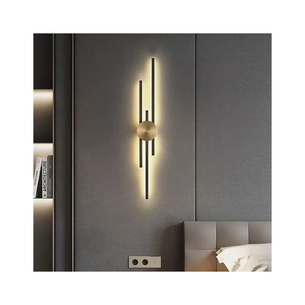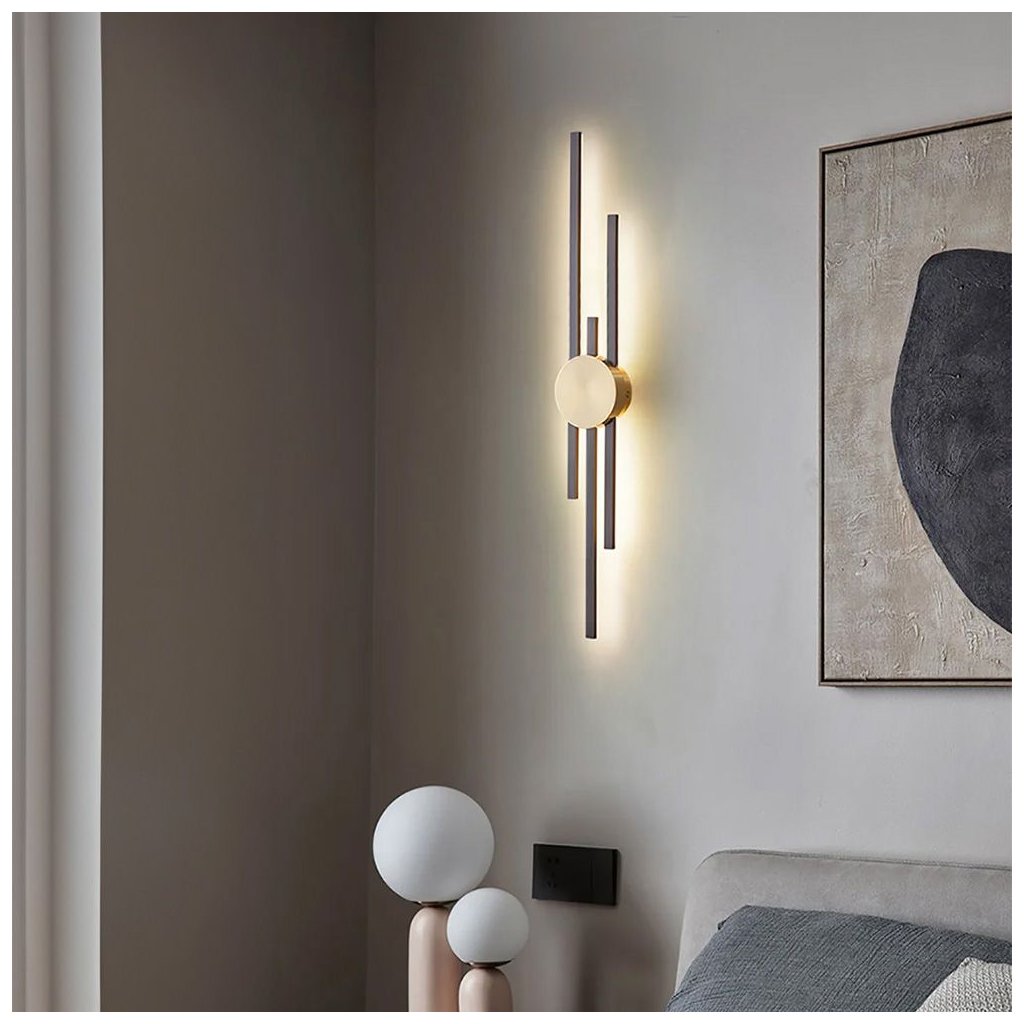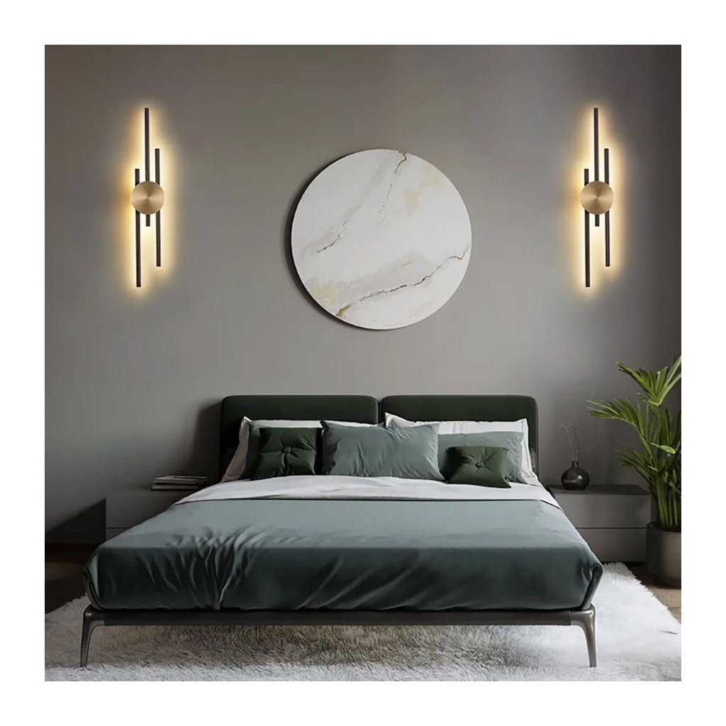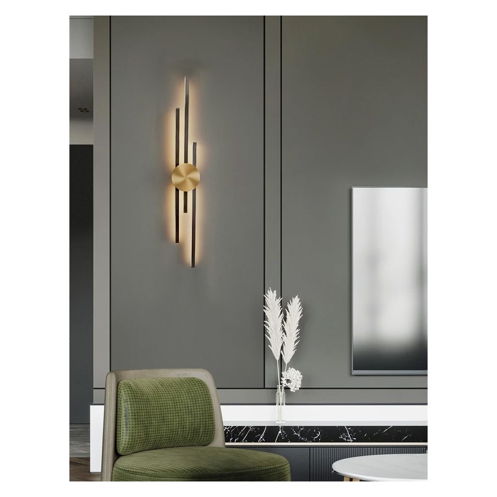 ⚜️ Moderní LED nástěnné svítidlo ve zlaté a černé barvě je jedinečným doplňkem každého interiéru, který spojuje eleganci s funkčností. Nástěnné svítidlo se vyznačuje minimalistickým, ale výrazným designem. Je ideální jako dekorativní osvětlení v obývacím pokoji, ložnici, chodbě nebo kanceláři.