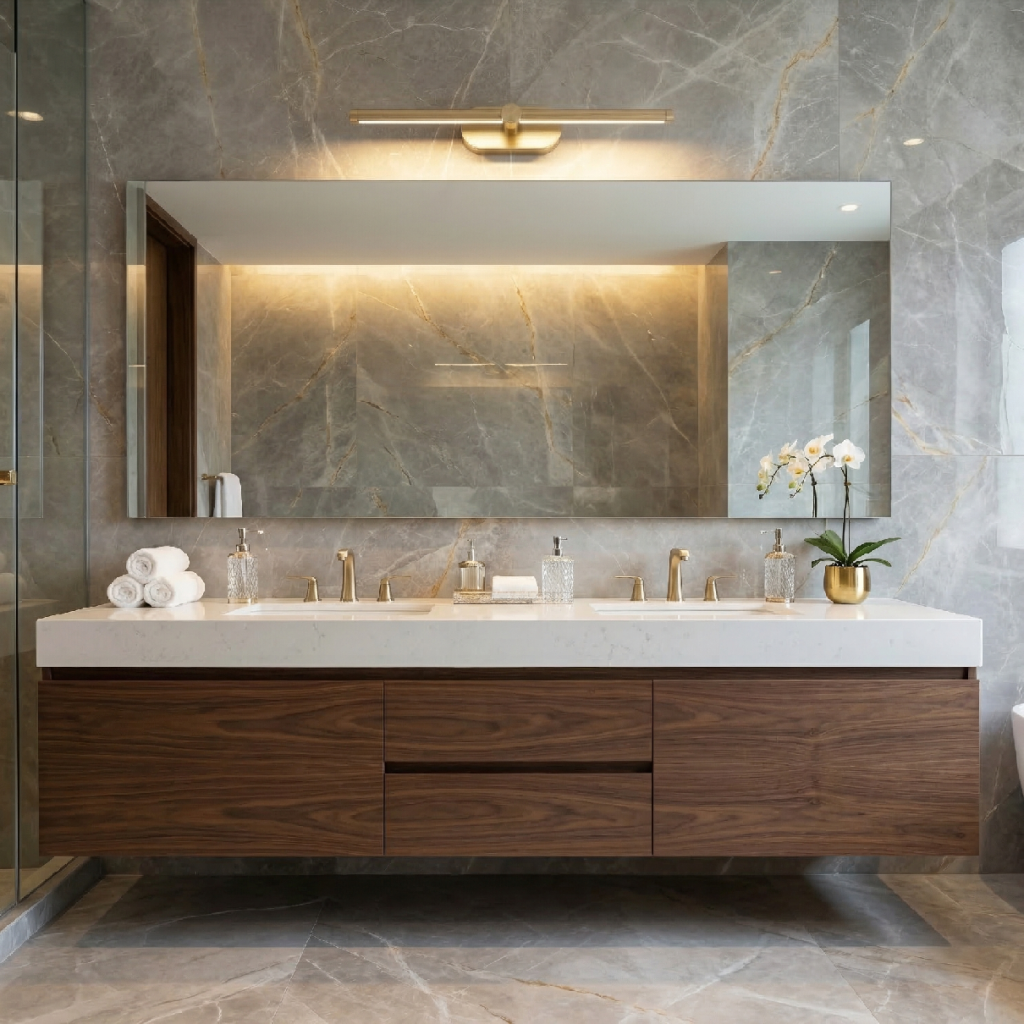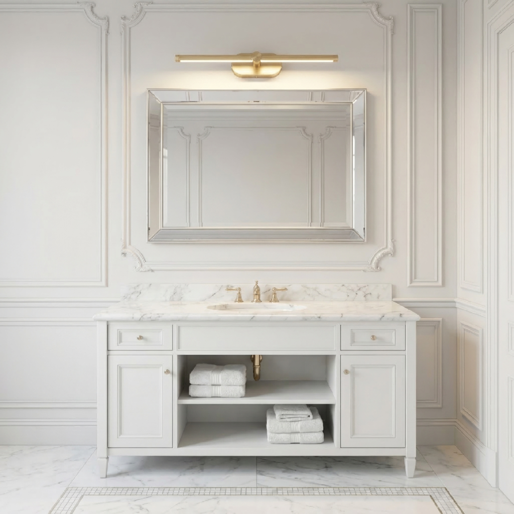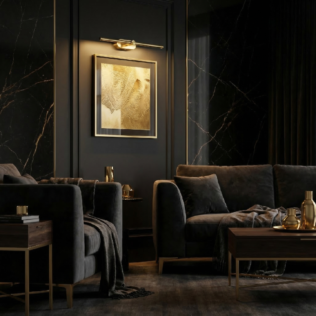Krátká délka 400 mm s hmotnějším profilem 85 mm předurčuje APP1892-1W pro konkrétní prostorové situace. Nad malá čtvercová zrcadla (60 × 60 cm a menší) je 400 mm proporčně ideální — nezasahuje za okraje zrcadla, ale pokrývá celou jeho šířku. V úzkých prostorách mezi dveřmi a rohem stěny, kde delší lampa nepasuje, poskytuje plnohodnotný světelný bod s kultivovaným zlatým charakterem.