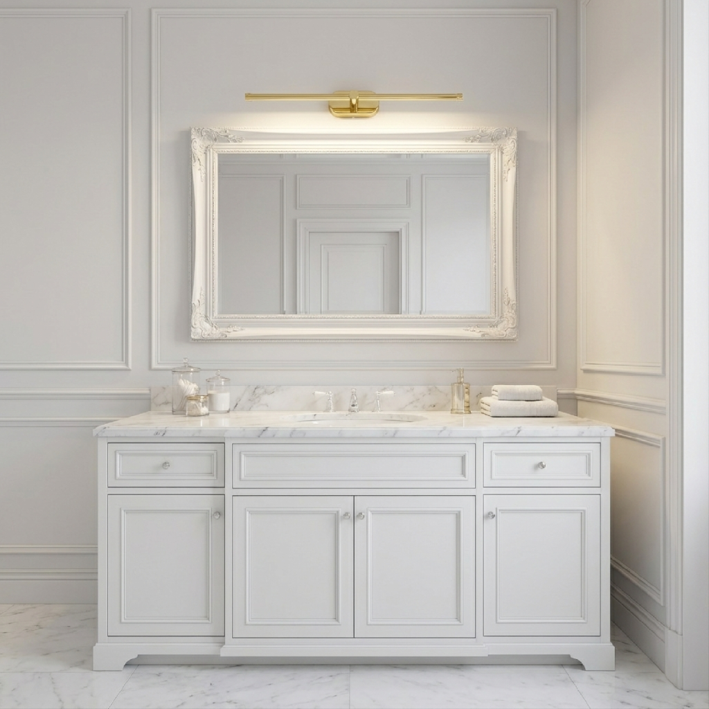 Délka 600 mm a lesklá zlatá povrchová úprava předurčují APP1890-1W i pro párovou vertikální instalaci po obou stranách zrcadla. Dvě 600 mm lesklé zlaté tyče namontované symetricky po levé a pravé straně zrcadla vytvářejí klasický Hollywood zrcadlový efekt – boční rovnoměrné osvětlení obličeje bez stínů, navíc rámcované teplou zlatou září. Výsledek je charakteristický pro luxusní koupelny a šatní místnosti.