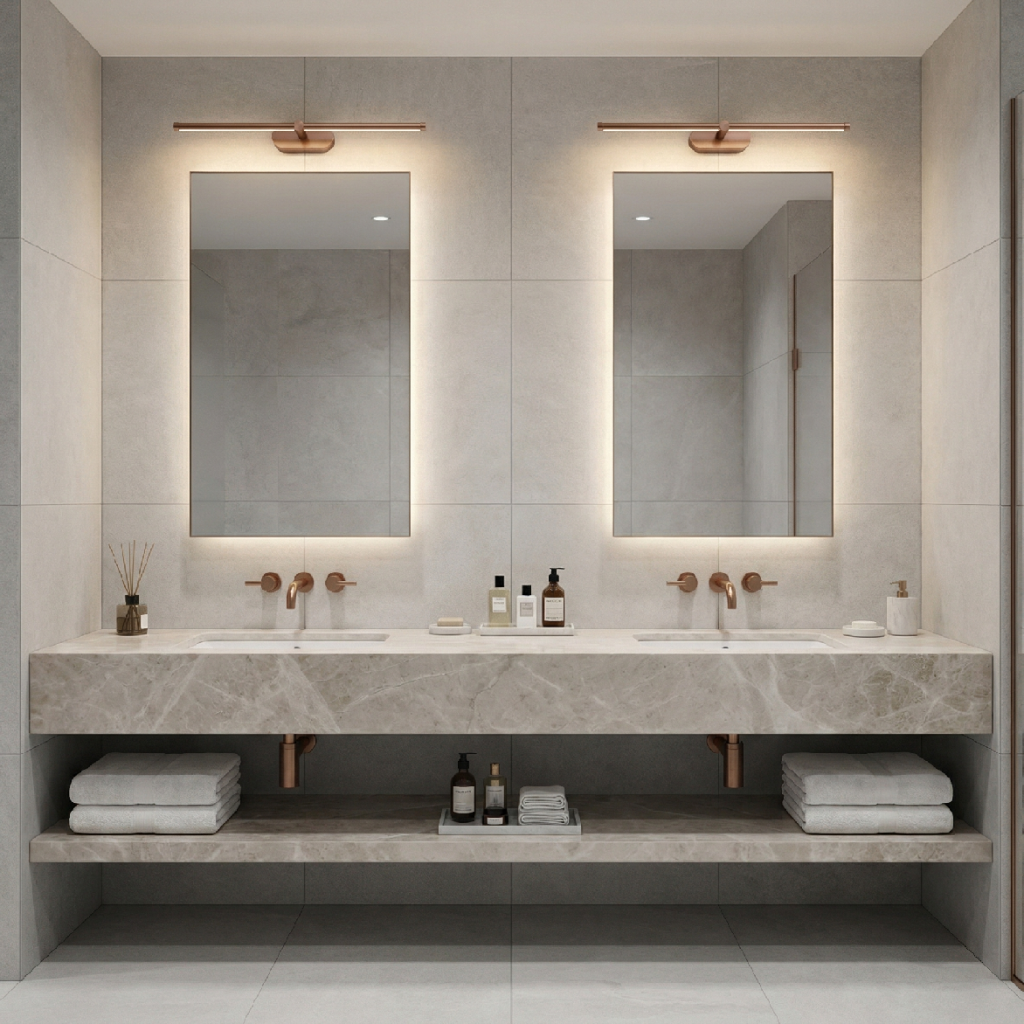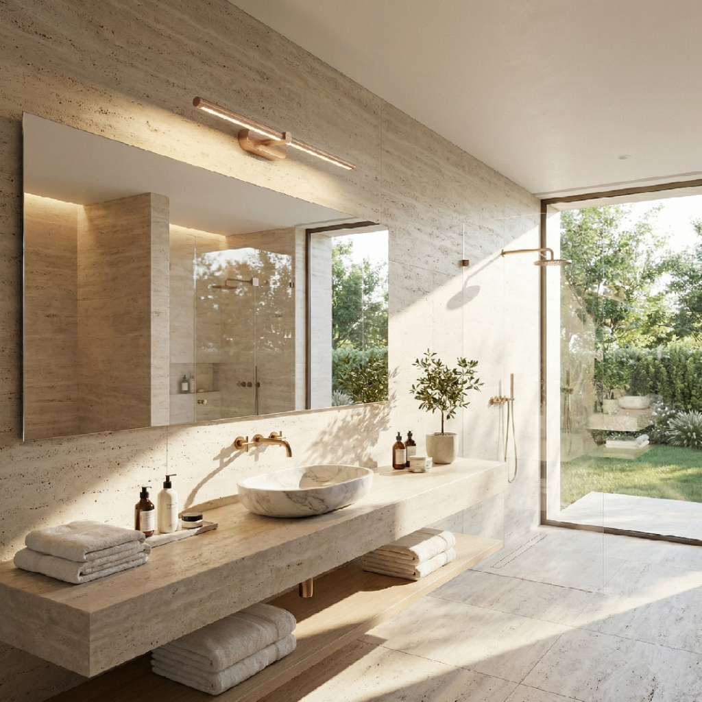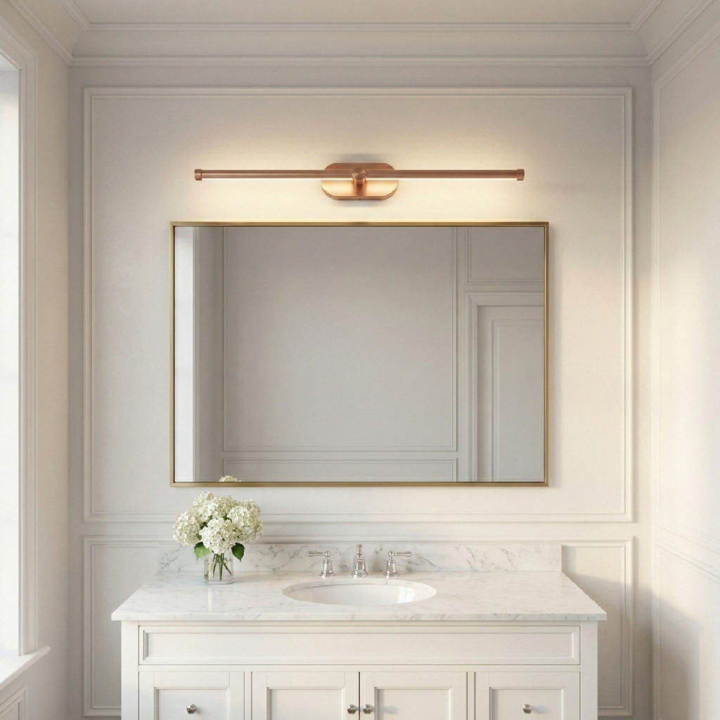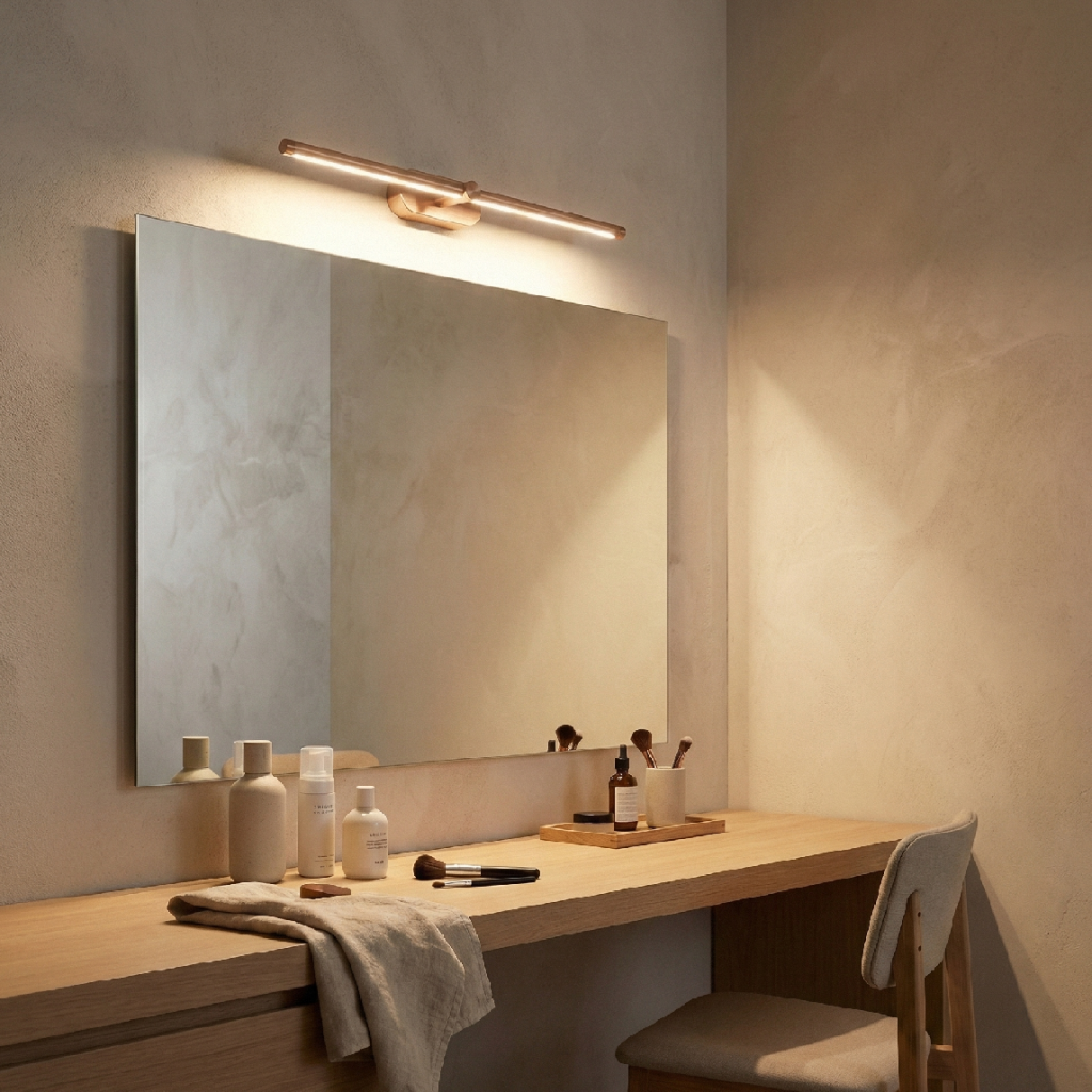Délka 600 mm předurčuje APP1896-1W i pro párovou instalaci po obou stranách většího zrcadla. Dvě 600 mm měděné tyče namontované vertikálně symetricky po levé a pravé straně zrcadla vytvářejí klasický efekt bočního osvětlení obličeje – rovnoměrná záře z obou stran eliminuje stíny pod nosem, bradou a kolem očí, které vznikají při horním stejnosměrném světle. Výsledek je srovnatelný s osvětlením profesionálních make-up studií.