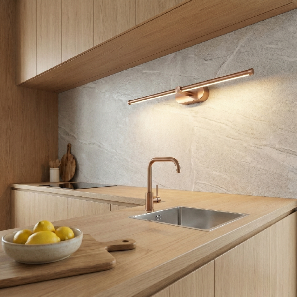 Měděná matná lampa APP1896-1W je přirozeným doplňkem do interiéru, kde měď tvoří systém materiálových odkazů – měděné baterie, měděné držák na ručník, měděné zrcadlový rám a nyní měděné lineární lampa nad zrcadlem. Každý tento prvek zvlášť je pěkný; všechny dohromady tvoří koherentní luxusní výraz, který je zjevně záměrný a promyšlený.