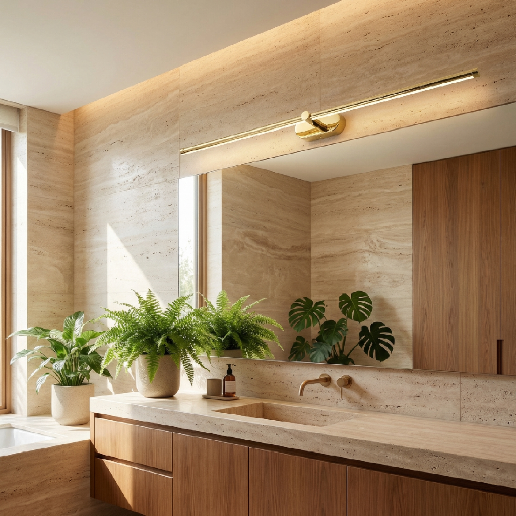 Délka 800 mm je optimální pro větší koupelnová zrcadla (70–90 cm šířky), kde kratší lampa by vypadala neproporčně, a pro šatní zrcadla podél celé šířky skříně. Lesklá zlatá u koupelnového zrcadla nad bílou sanitární keramikou nebo tmavými obklady vytváří dekorativní zlatou lištu, která celou stěnu zvedá na úroveň luxusního hotelového koupelnového designu.