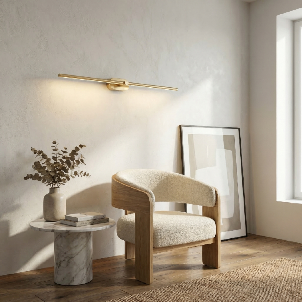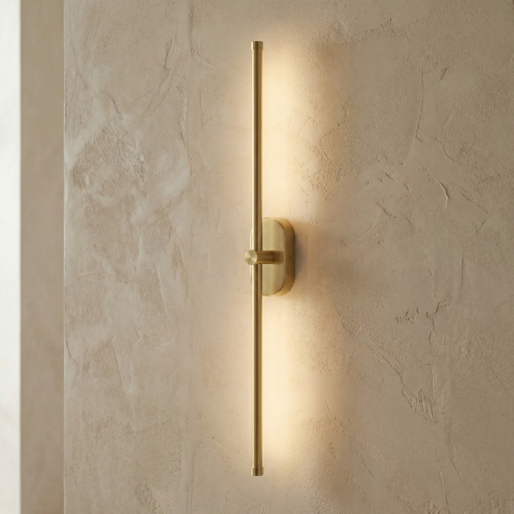 Nástěnná lampa od Toolight je nejdelší model zlaté lineární série s profilem 85 × 60 mm – kompaktní šířka a výška tyče kontrastují o délce 800 mm a vytvářejí typickou lineární estetiku, kde horizontální linie dominuje a vertikála je minimalizována. Zlatá matná povrchová úprava tyč definuje jako záměrný kovový akcent, který stěnu obohatí, nikoli zahltit.
