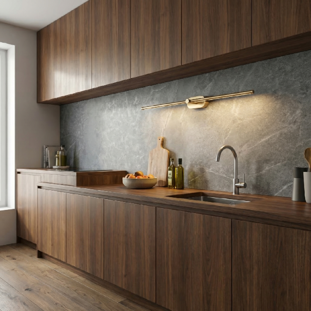 Délka 800 mm definuje využití lampy APP1894-1W – je to svítidlo pro prostory, kde kratší verze nestačí. Nad koupelnovým zrcadlem šířky 70–90 cm pokrývá celou šířku zrcadlové plochy bez zbytečného přesahu. V šatníku nad dlouhou zrcadlovou plochou nebo mezi dvěma sekcemi skříně vytváří souvislý světelný pruh, který rovnoměrně osvětluje celou pracovní plochu šatníku. Nad jídelní stěnou s galerii obrazů slouží jako dekorativní světelný akcent, který prostor sjednocuje.