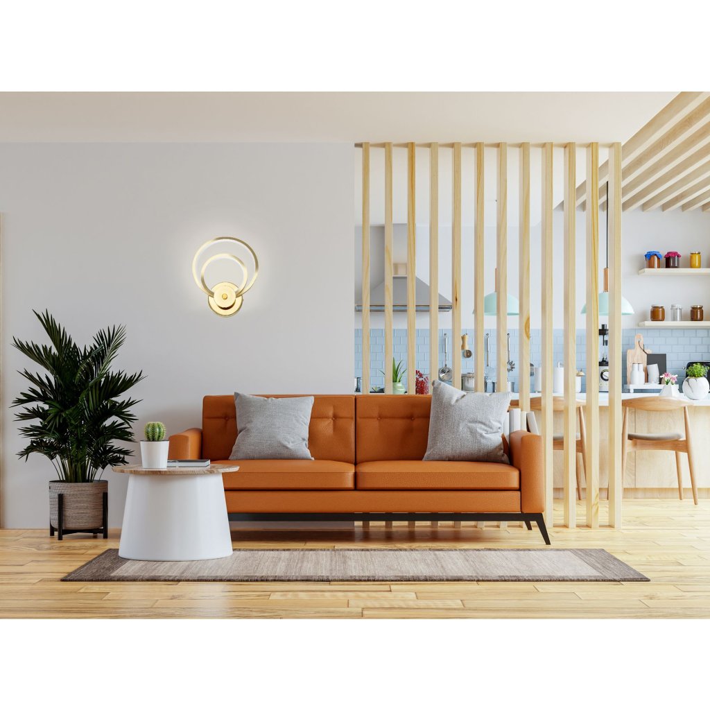 Lampa zlaté barvy nezahyne na pozadí bílé stěny a prostorová forma dává lehkost.