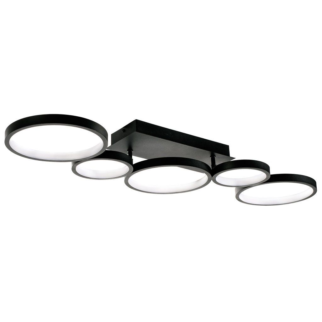 Stropní verze lampy APP1923-CP Black od Toolight přináší stejnou geometrickou kompozici více kruhů různých velikostí jako závěsná verze – ale přiklání ji těsně ke stropu. Celá plocha 850 × 210 mm se stává součástí stropní roviny, kde černé kruhy působí jako záměrná architektonická intervence přímo na stropě, nikoli jako zavěšený objekt ve vzduchu.