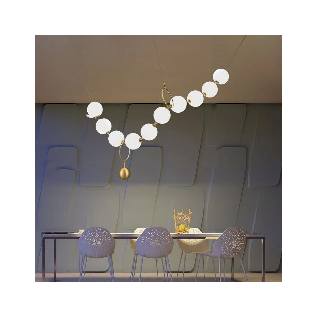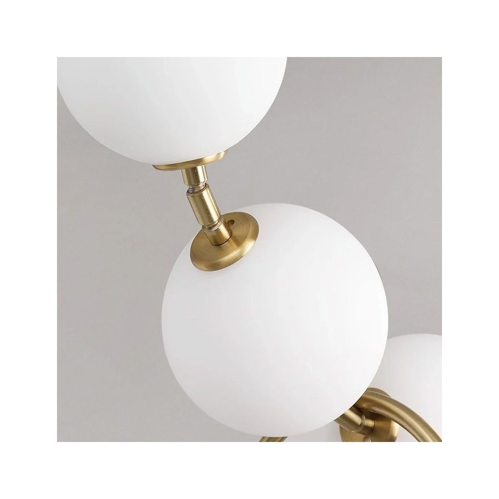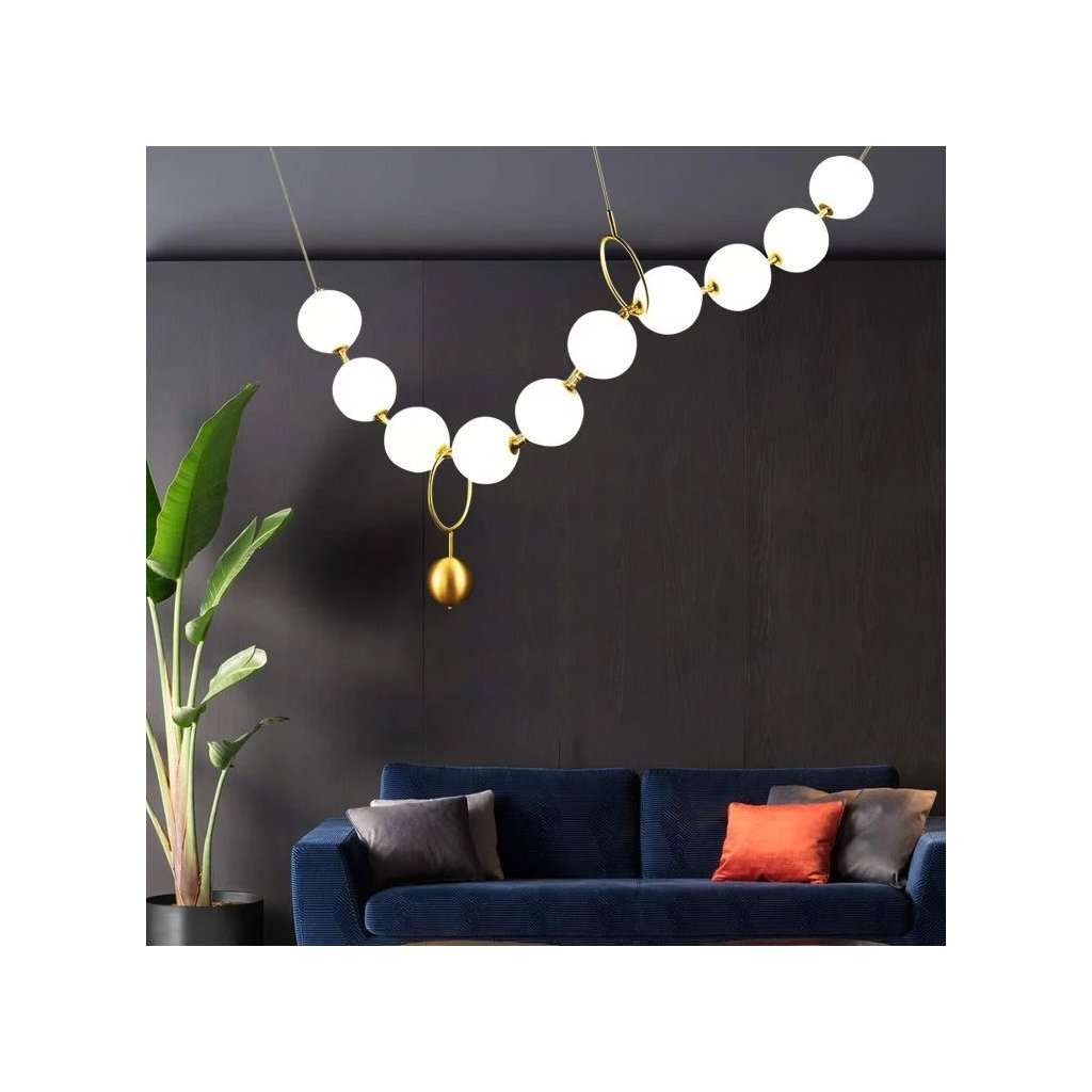 ✴️ Lampa má jedinečný, umělecký vzhled, který upoutá pozornost a dodá eleganci každé místnosti . Skládá se ze série sférických stínidel vyrobených z bílého matného skla, které vytvářejí působivou kompozici. Zlaté designové prvky dodávají luxusní nádech a dokonale ladí s bílými odstíny.