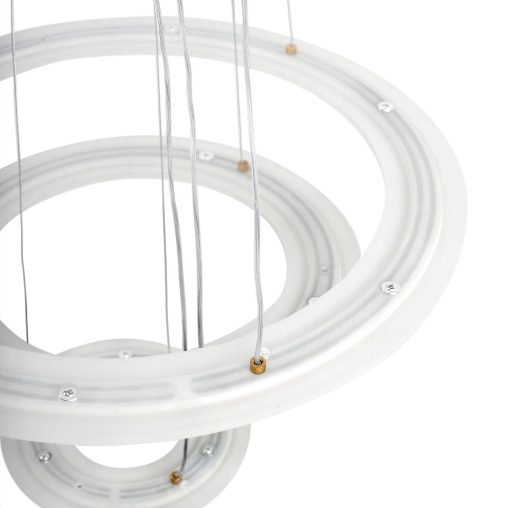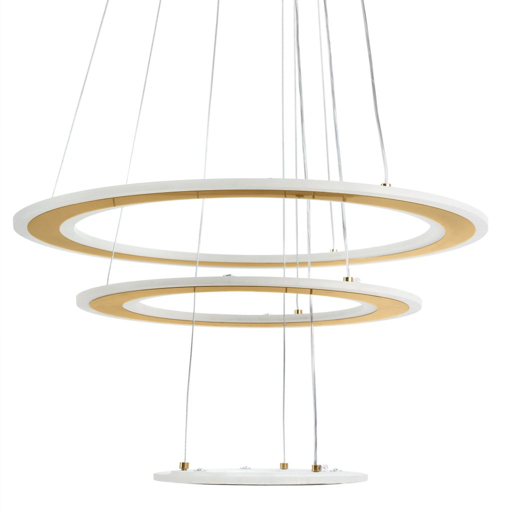 - LED závěsné svítidlo s jedinečným, moderním designem je vynikající volbou pro milovníky elegantních a minimalistických řešení. Kulatý tvar tří kroužků umístěných na nastavitelných držácích vám dává svobodu při uspořádání prvků. Zlatá povrchová úprava činí z lampy ústřední bod každého prostoru.