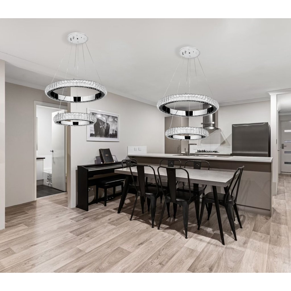 ✴️ Moderní stropní svítidlo glamour je vynikající volbou pro ty, kteří hledají elegantní osvětlení s vizuálním efektem. Dva nápadné kroužky v chromu jsou zdobeny třpytivými krystaly, které krásně odrážejí světlo. Tato kompozice vytváří mimořádně stylový a luxusní přízvuk, ideální pro současný interiérový design. Chromové čalounění stropu dodává celku moderní lesk.