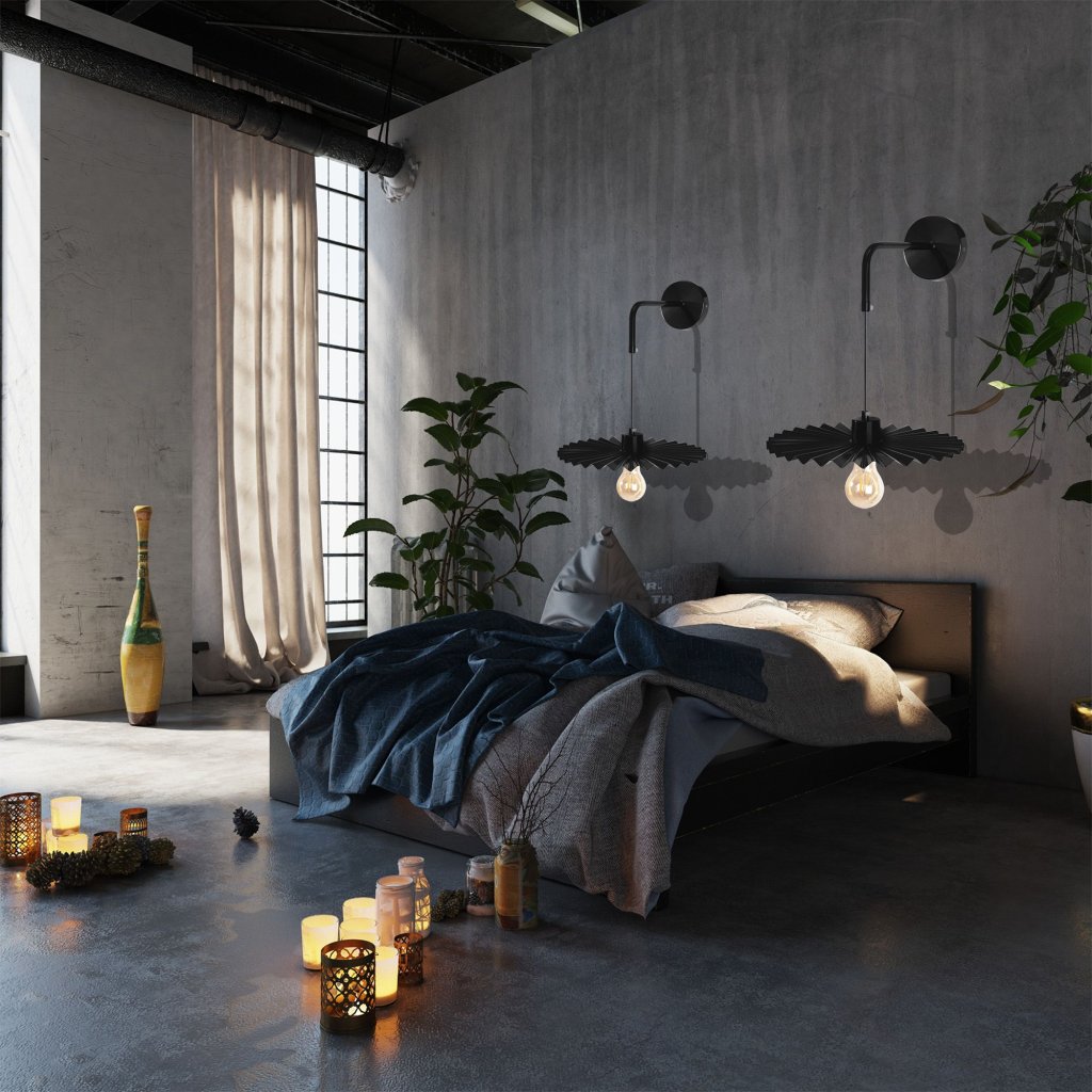 Nástěnná lampa vyrobená v industriálním stylu vyzařuje přirozenou krásu a teplo. Svítilna je vyrobena z černého kovu. Lehký a odolný materiál mu dodá jedinečný charakter. Díky jednoduchému stylu se nástěnná lampa hodí do každé místnosti – ať už do ložnice, koupelny nebo obývacího pokoje.