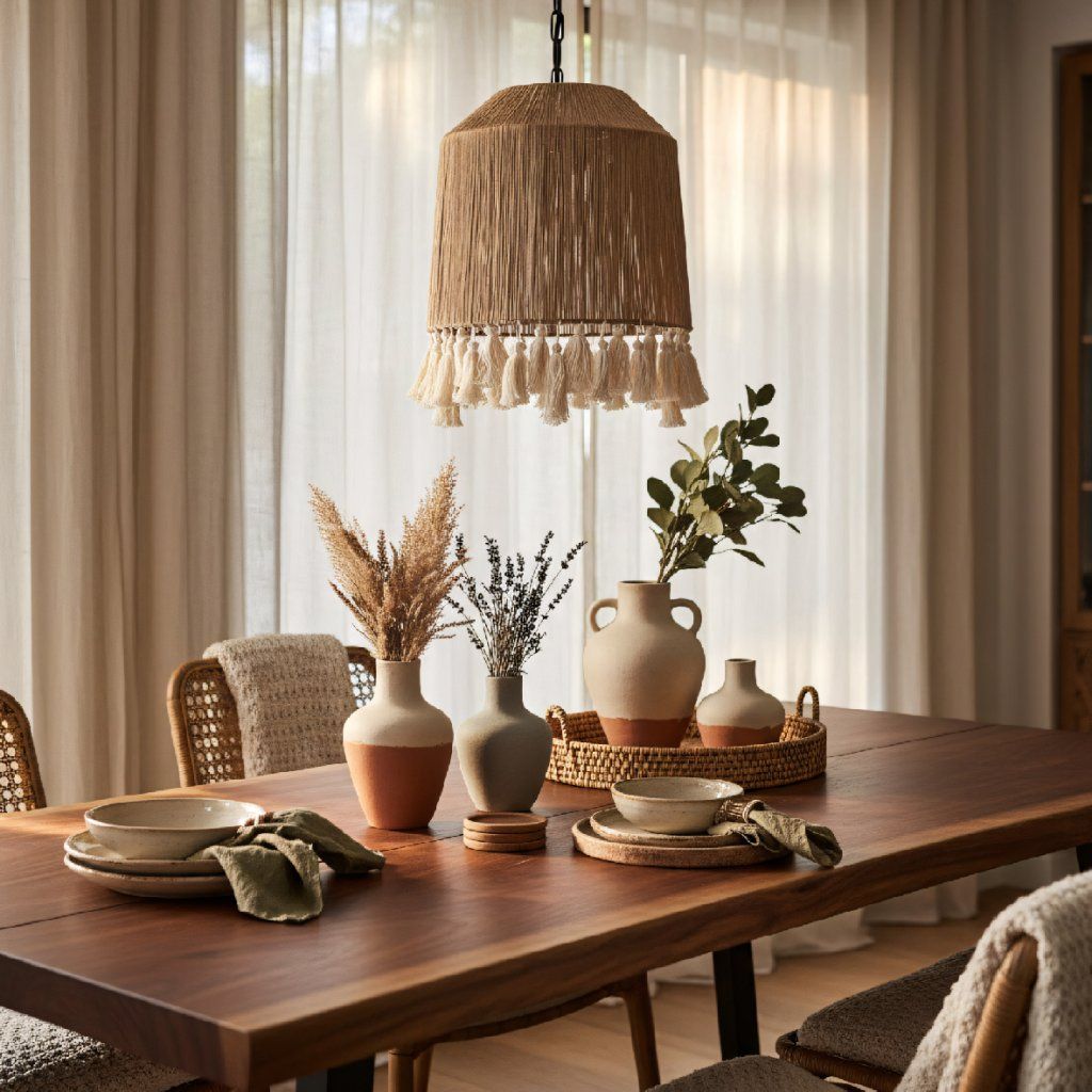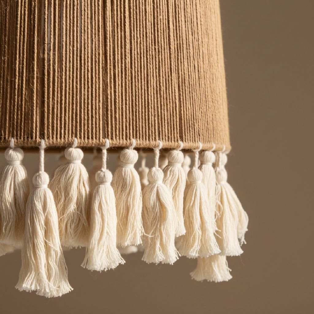 Bohémská závěsná lampa zaujme kombinací přírodních materiálů a jemné, dekorativní formy. Stínítko z jutové šňůrky vytváří teplou, útulnou atmosféru a dekorativní třásně přidávají lehkost a charakteristický etnický výraz. Celé zařízení je postaveno na pevné kovové konstrukci, která zaručuje stabilitu a dokonalé detailní zpracování. Je ideální volbou do obývacího pokoje, ložnice, jídelny nebo interiérů zařízených v bohémském, etno, skandinávském nebo rustikálním stylu. Lampa má držák na populární žárovku E27, který vám umožňuje svobodně si vybrat barvu a výkon světla dle vlastních představ. Je to dekorativní lampa, která nejen osvětluje, ale také zdobí a dodává interiéru jedinečný charakter.