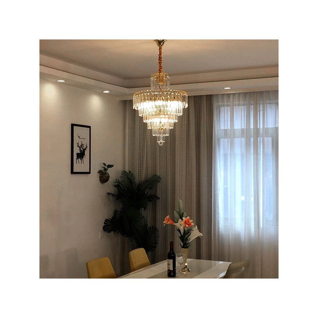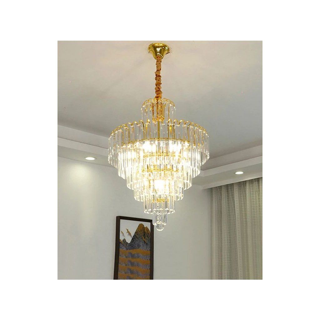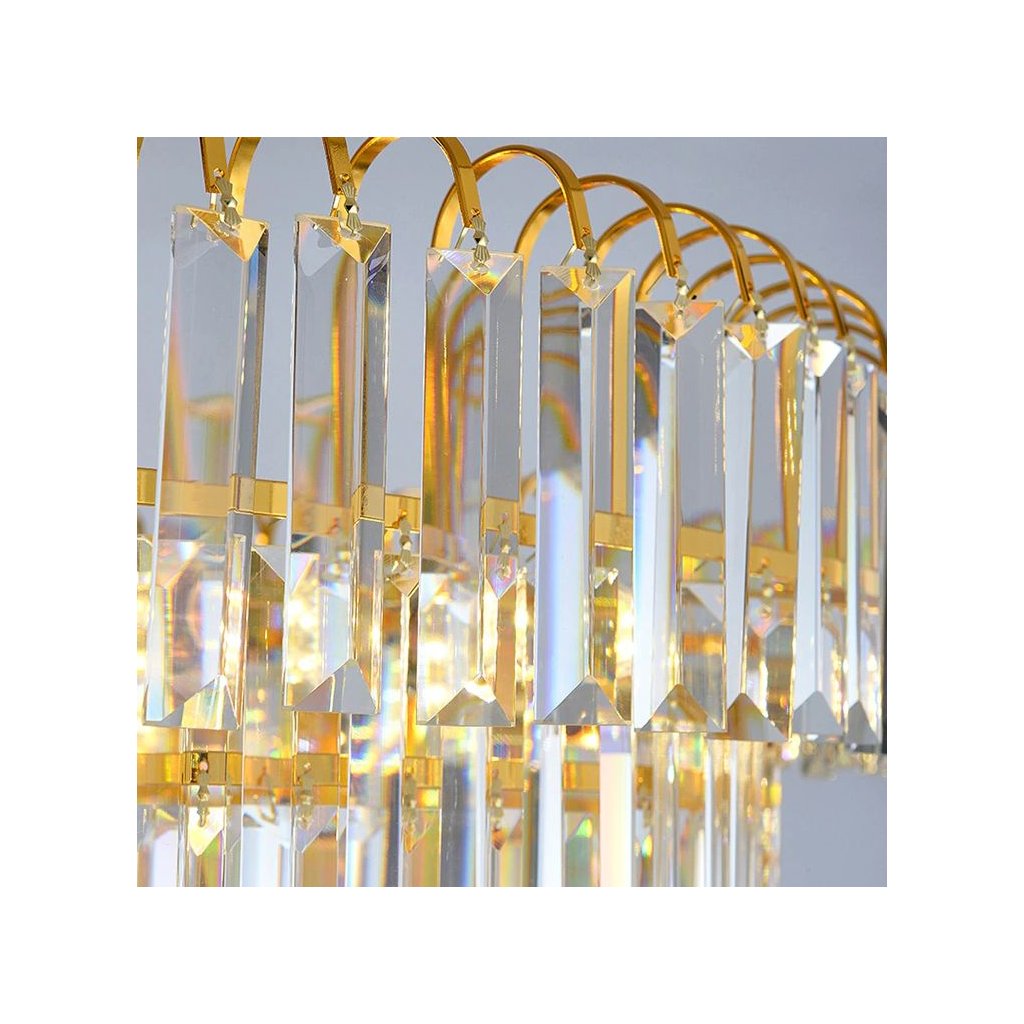 - Exkluzivní vzhled – víceúrovňové křišťálové stínítko v kombinaci se zlatou strukturou dodává interiéru reprezentativní a luxusní charakter.
