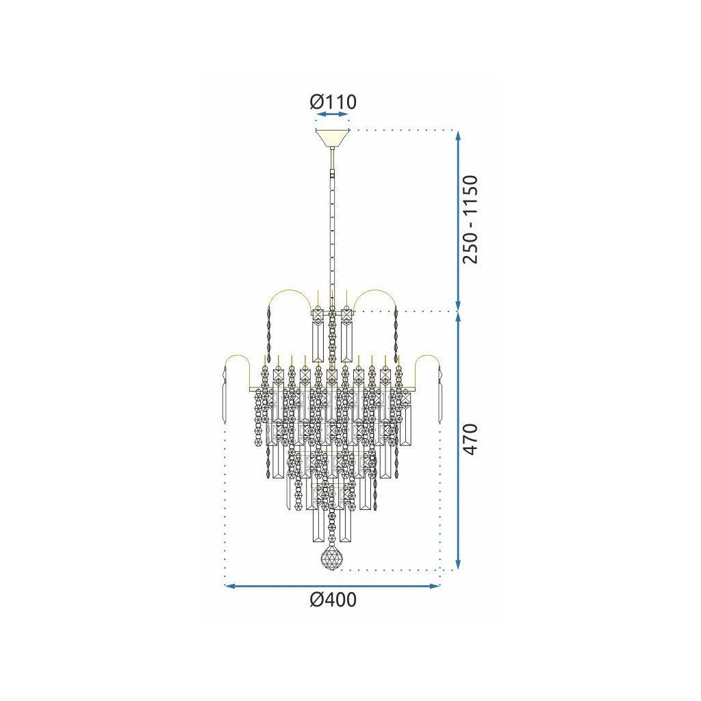 Lampa je vyrobena z kvalitního kovu a zdobená mnoha krystaly , které krásně lámou světlo a vytvářejí fenomenální světelný efekt. Jeho forma je inspirována klasickými palácovými lustry, ale díky moderním detailům se bude perfektně hodit i do současných aranžmá jako glamour, moderní klasika nebo art deco.