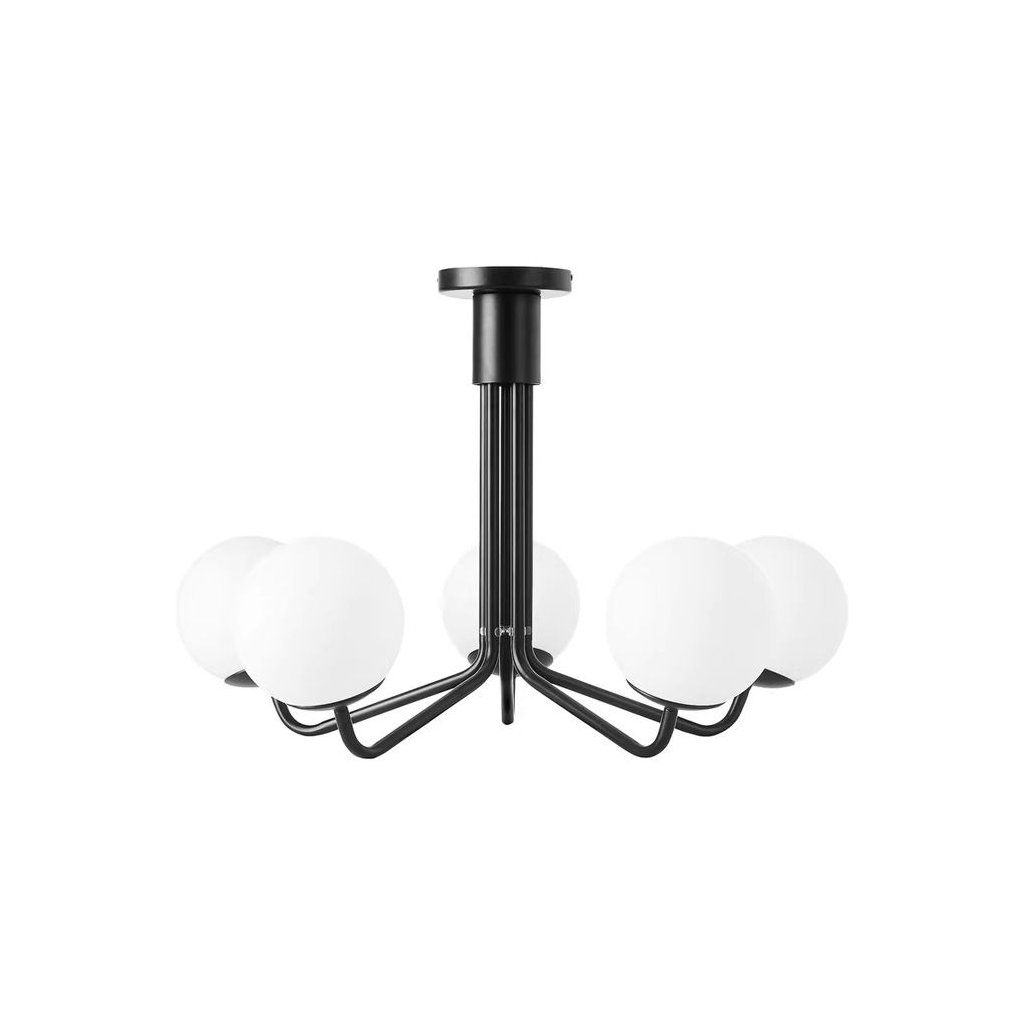 Moderní a stylové stropní svítidlo, které zaujme jedinečným tvarem a minimalistickým designem. Vybaven šesti kulovými stínítky z mléčného skla, které jemně rozptylují světlo a vytvářejí příjemnou atmosféru v místnosti. Černý kovový rám v kombinaci s jednoduchým geometrickým uspořádáním stínítek dodává lampě elegantní a moderní charakter, který se dokonale hodí do interiérů v industriálním, moderním a minimalistickém stylu.