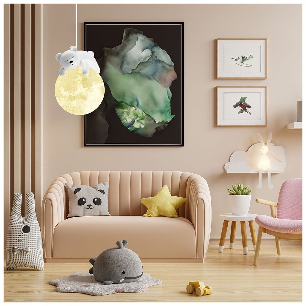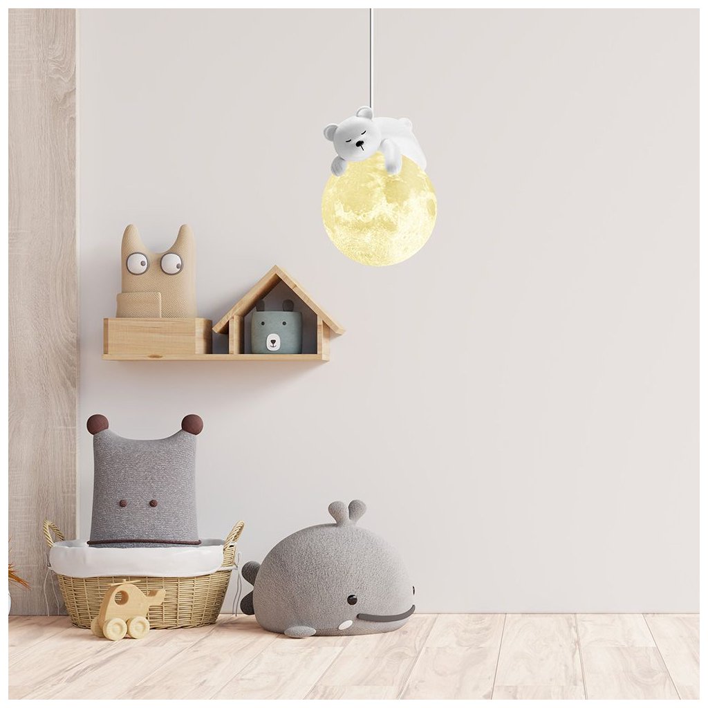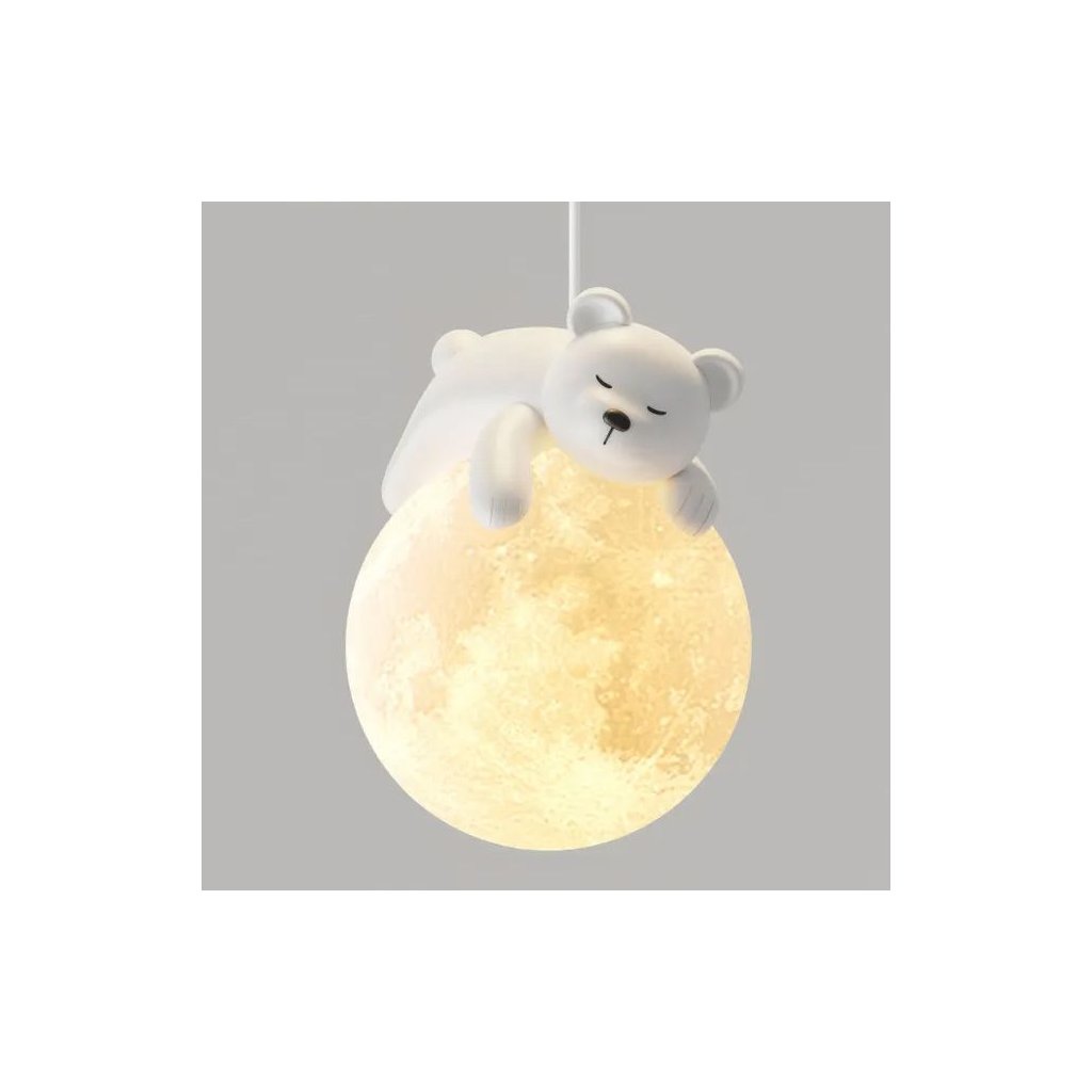 - Unikátní design: Okouzlující lampa se stínítkem ve tvaru měsíce a dekorativní figurkou plyšového medvídka, ideální do dětského pokoje.