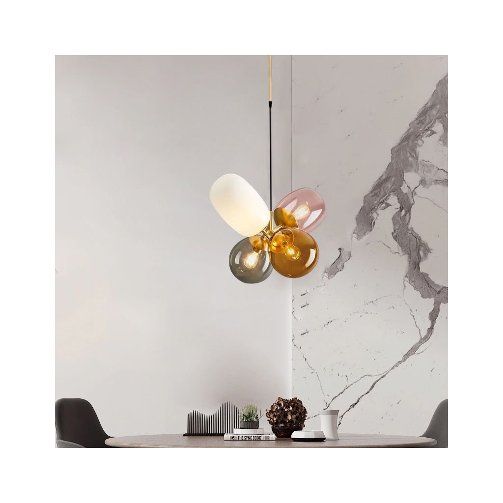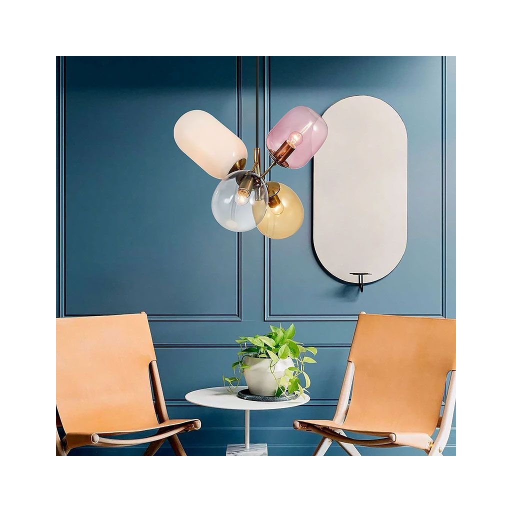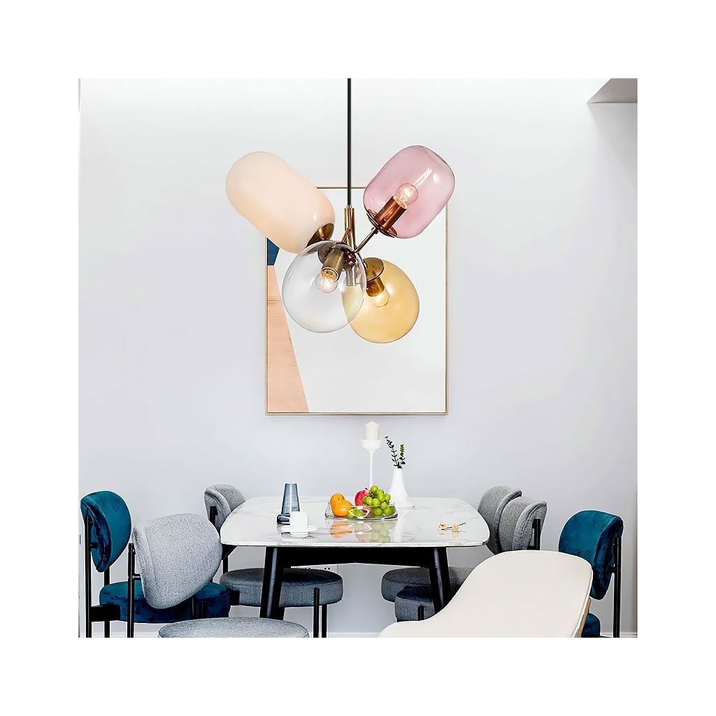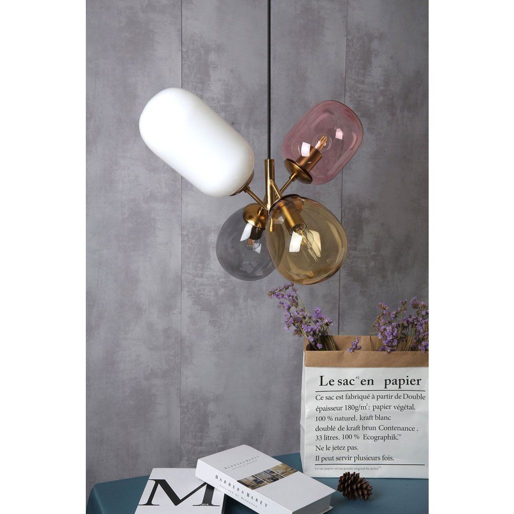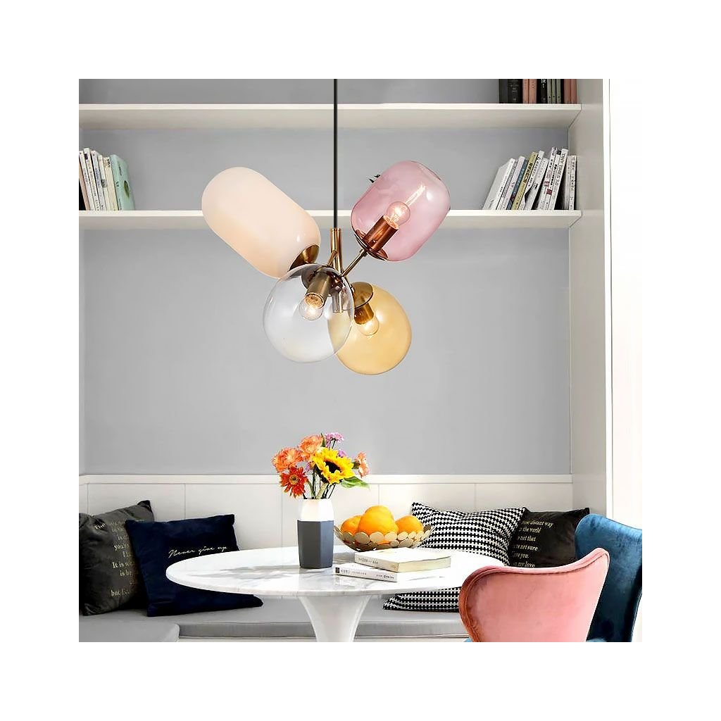 Neobvyklá lampa se 4 různými barevnými stínítky v různých tvarech. Design svítidla je mimořádně prostorný a originální tvar jej dokonale sladí s jakýmkoli uspořádáním a účelem místnosti. Ložnice, obývací pokoj nebo dětský pokoj - v každém z těchto pokojů bude vypadat skvěle.