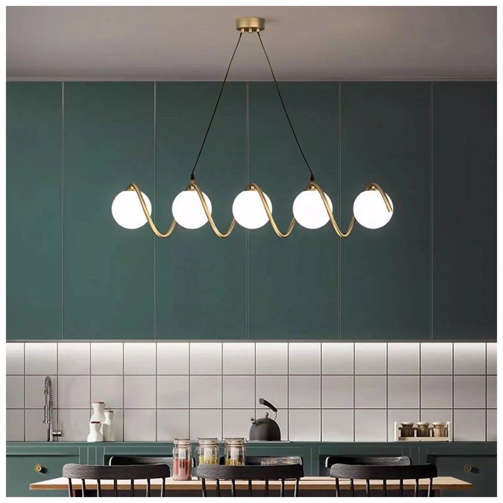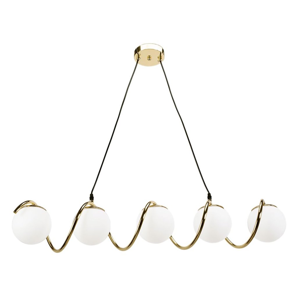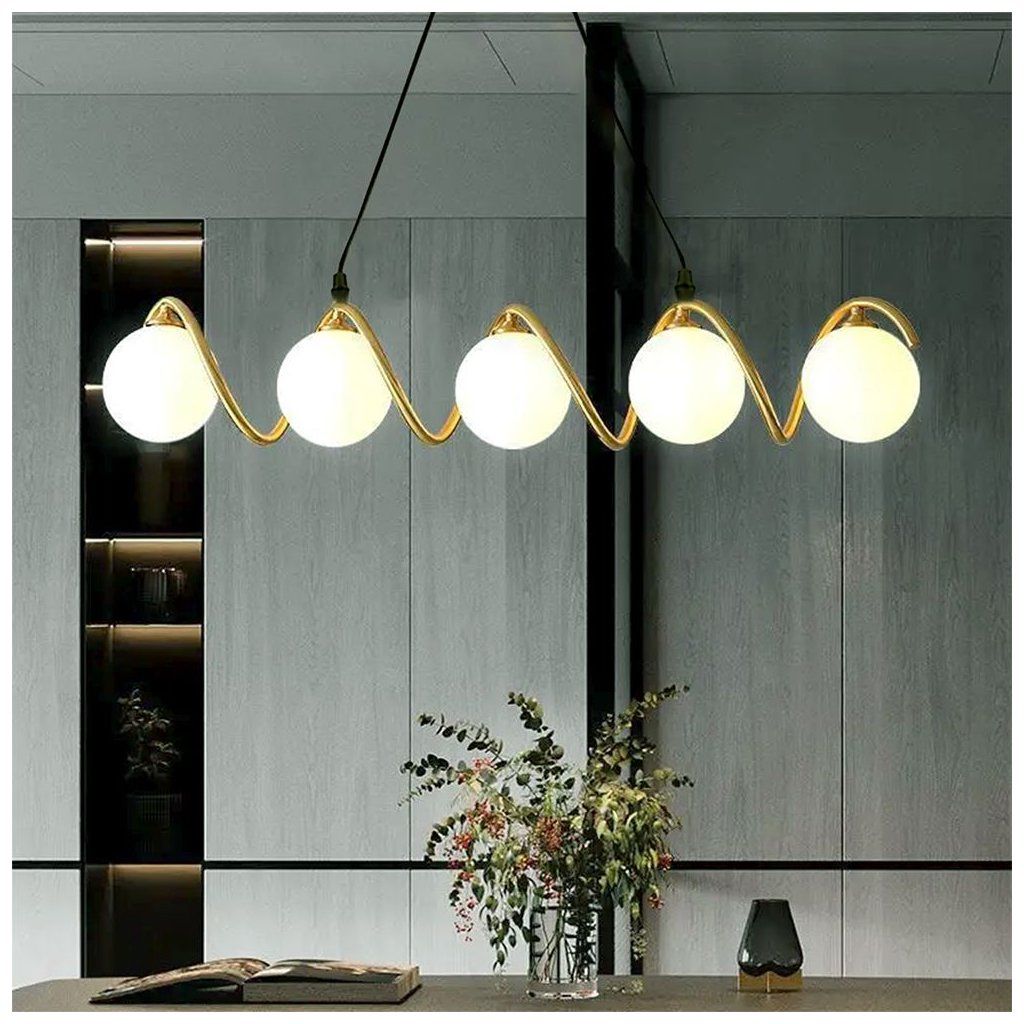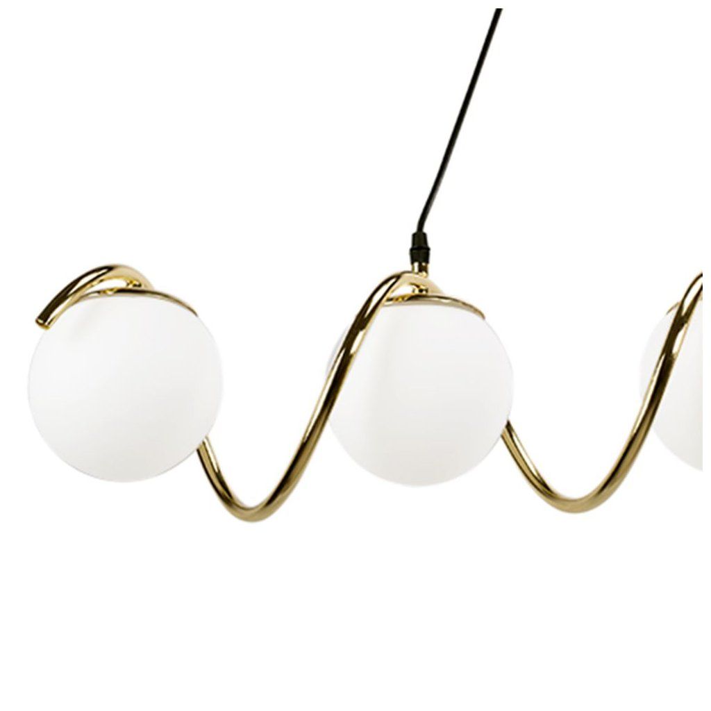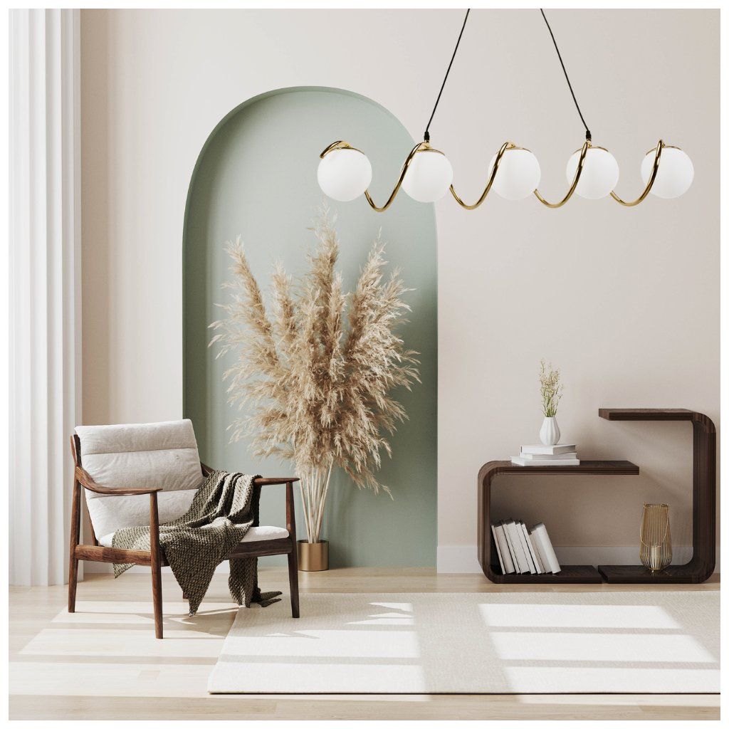 Působivá závěsná lampa s pěti kulovými stínítky je ideální volbou pro lidi, kteří oceňují moderní eleganci a originální tvary. Matné, mléčné bílé koule byly umístěny na stylově ohnutém rámu zlaté barvy, čímž vytvořily lehkou a dynamickou kompozici. Lampa se bude perfektně hodit do jídelny, nad kuchyňským ostrovem, do obývacího pokoje nebo do elegantní haly. Díky pěti světelným bodům efektivně osvětluje prostor a zároveň je sám o sobě dekorací. Je to jedinečná kombinace užitkových a dekorativních funkcí v jednom moderním designu.