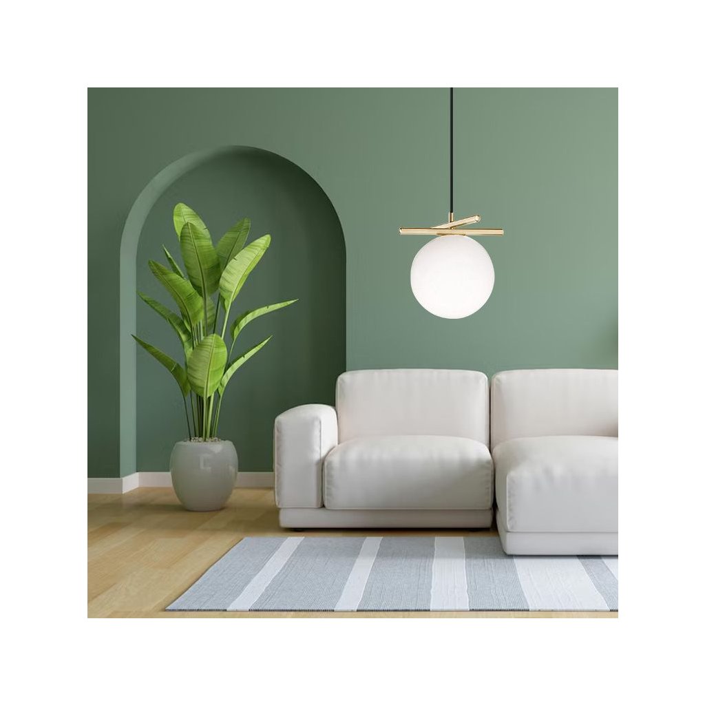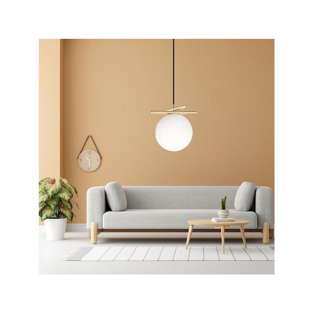 ☀️Elegantní závěsná lampa z kovu a skla je ideální volbou pro milovníky moderních a minimalistických interiérů. Kombinace mléčně bílého skleněného stínítka s kovovou, zlatou povrchovou úpravou mu dodává jedinečný charakter a jemnou eleganci.