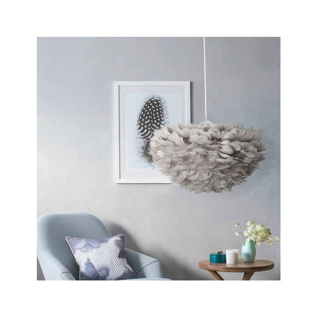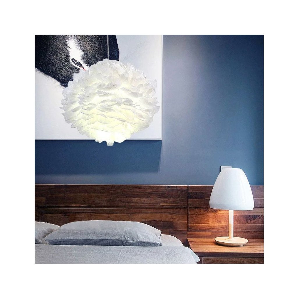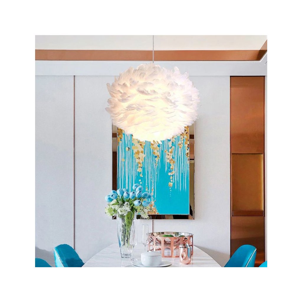 Lampa je vyrobena z ručně lepeného přírodního peří a kovového rámu.