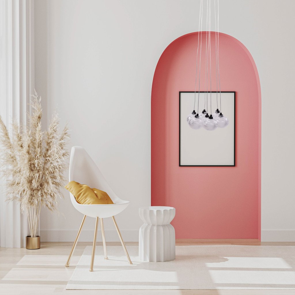 Tato elegantní závěsná lampa se sedmi dekorativními akrylovými stínítky kombinuje moderní design s klasickou estetikou. Průhledná, efektivní stínítka krásně rozptylují světlo a vytvářejí jedinečnou atmosféru v každém interiéru. Lampa je ideální jako centrální aranžérský prvek v obývacím pokoji, jídelně, nad stolem nebo ve vysoké hale.